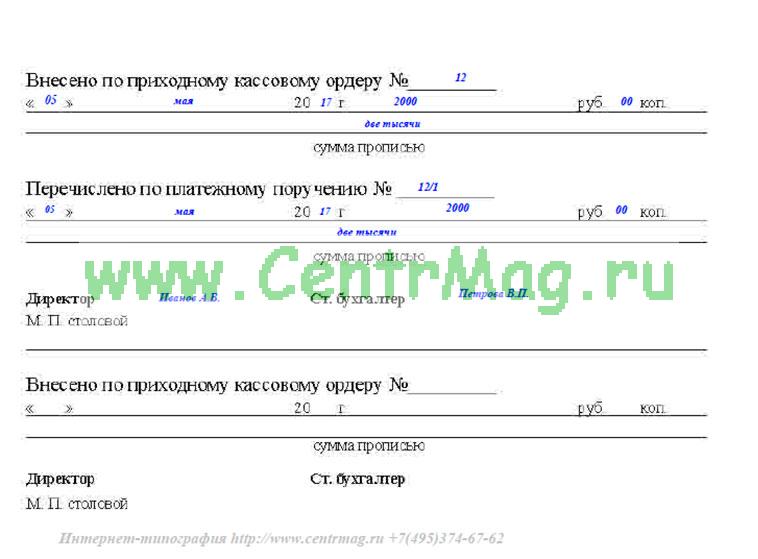 - Внесено по приходному кассовому ордеру №, дата