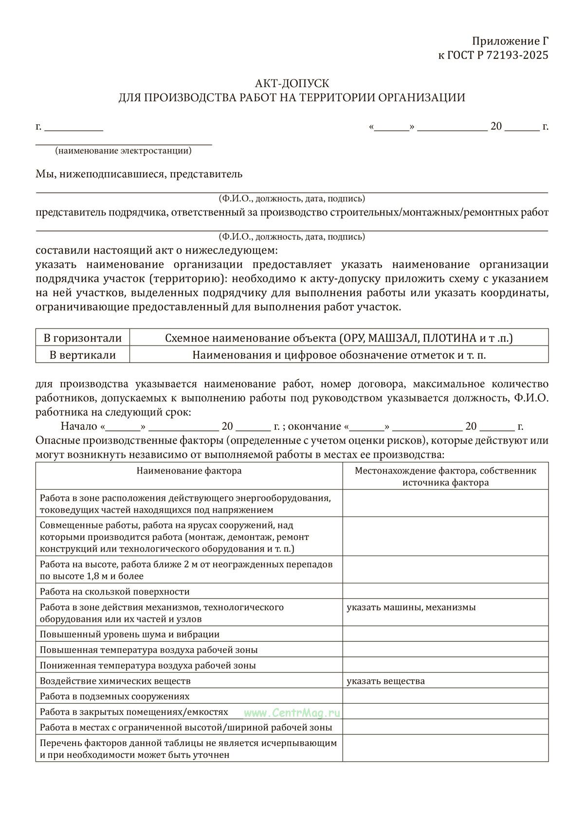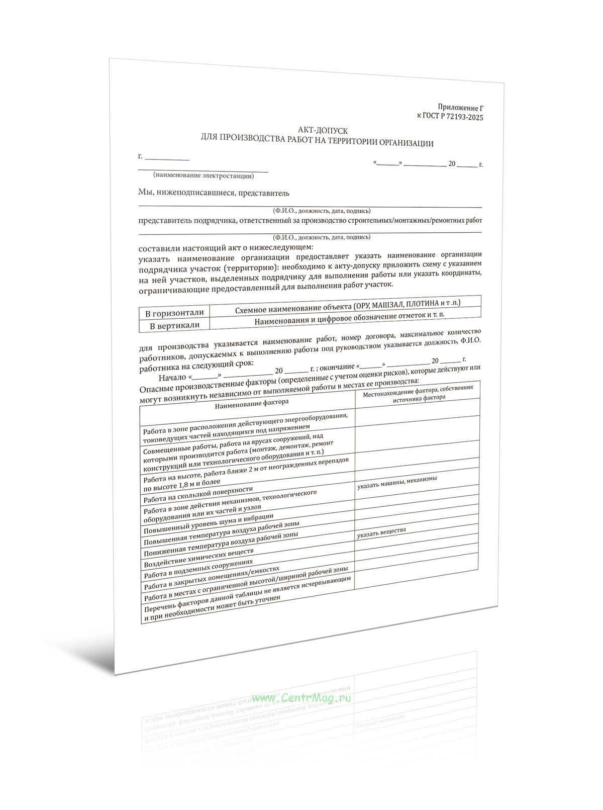 Форма Акта-допуска к работам, выполняемым подрядными организациями соответствует Приложению Г к Приказу Федерального агентства по техническому регулированию и метрологии от 8 июля 2025 г. № 701-ст