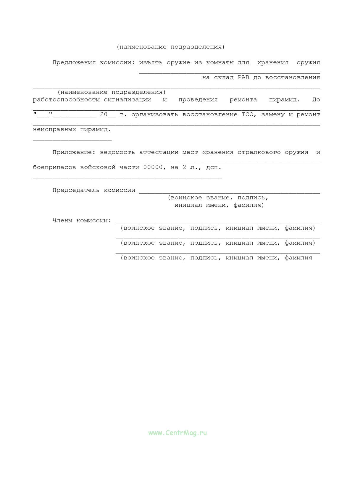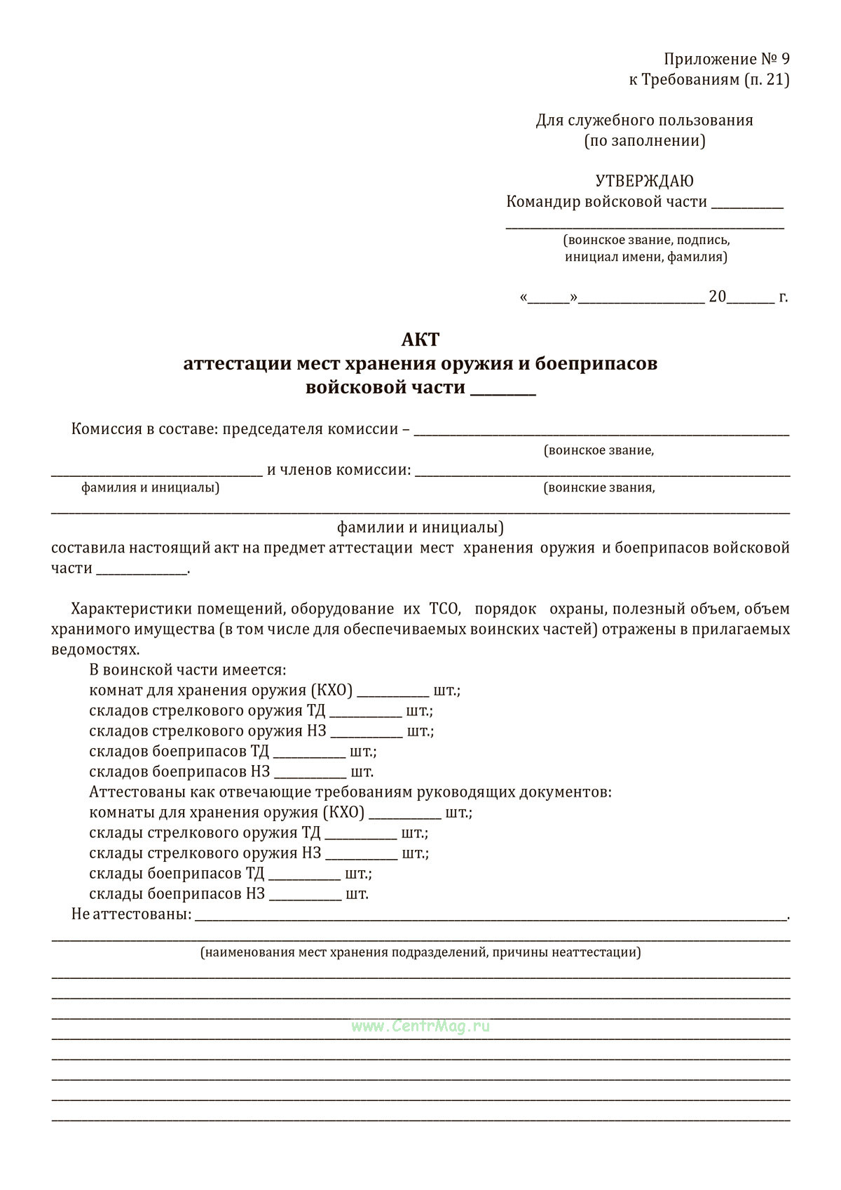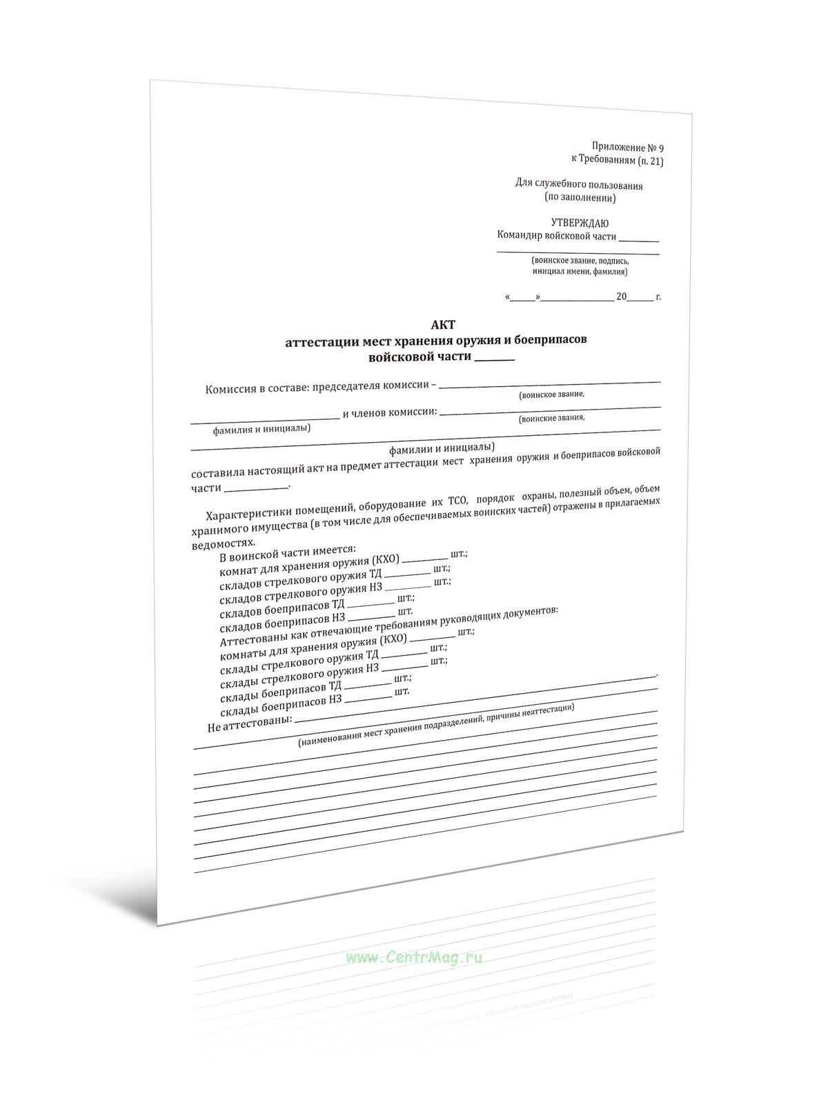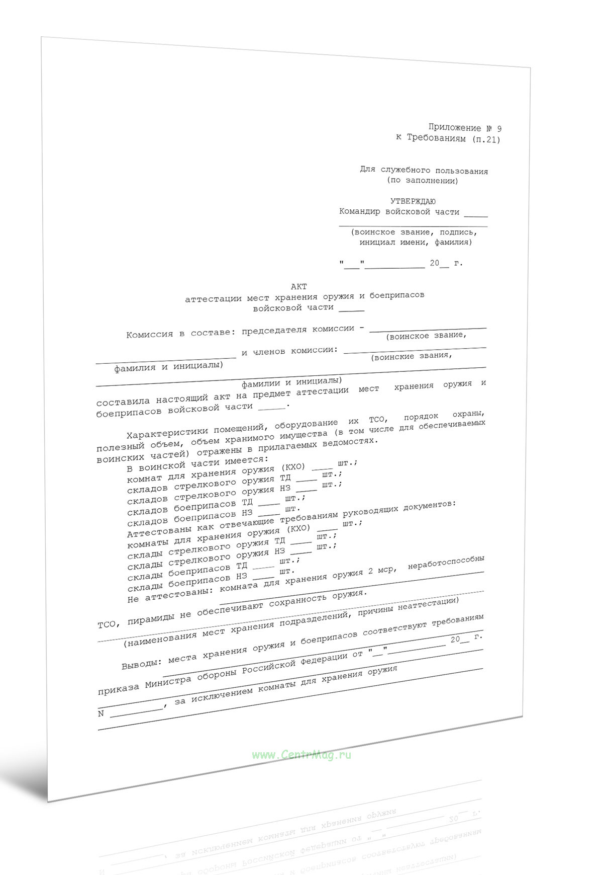 Акт аттестации мест хранения оружия и боеприпасов войсковой части продается только как чистый незаполненный бланк, без печатей и подписей соответствует 149-ФЗ от 27.07.2006