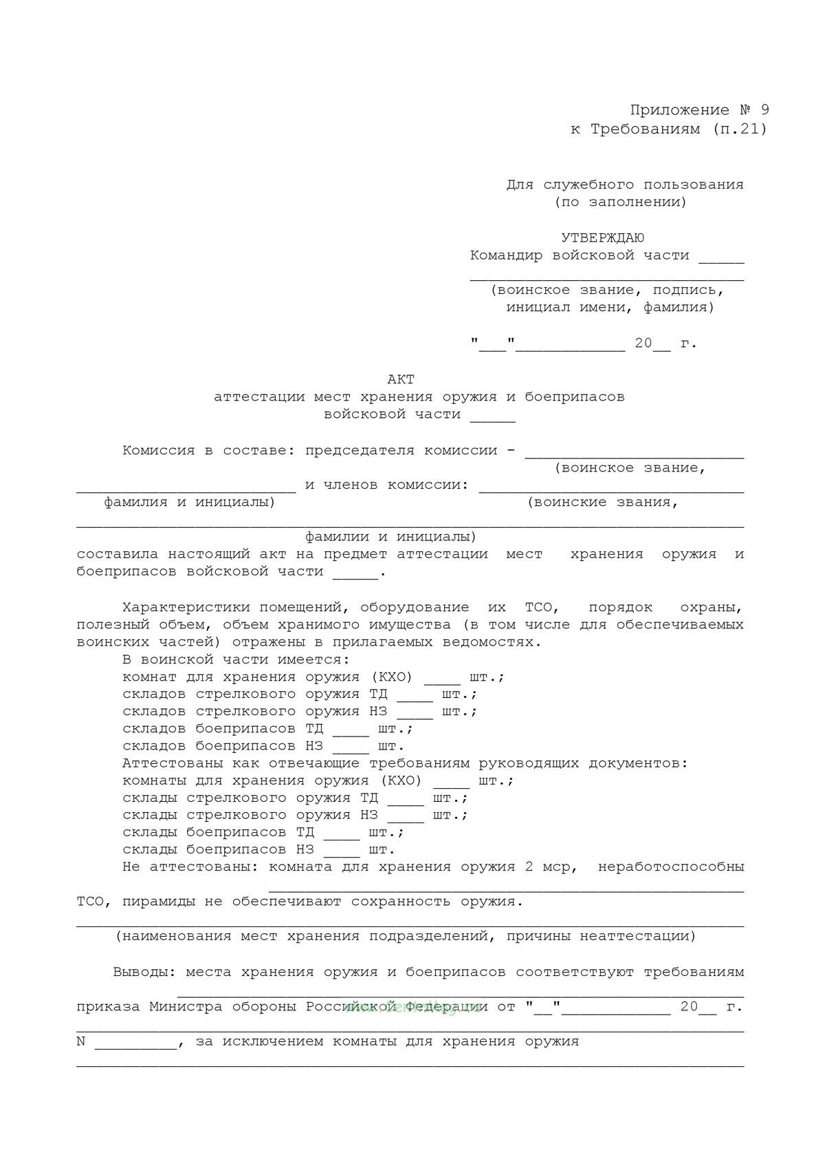 Форма Акта аттестации мест хранения оружия и боеприпасов войсковой части соответствует Приложению 9 к Приказу Министра обороны РФ от 8 июля 2020 г. N 299.