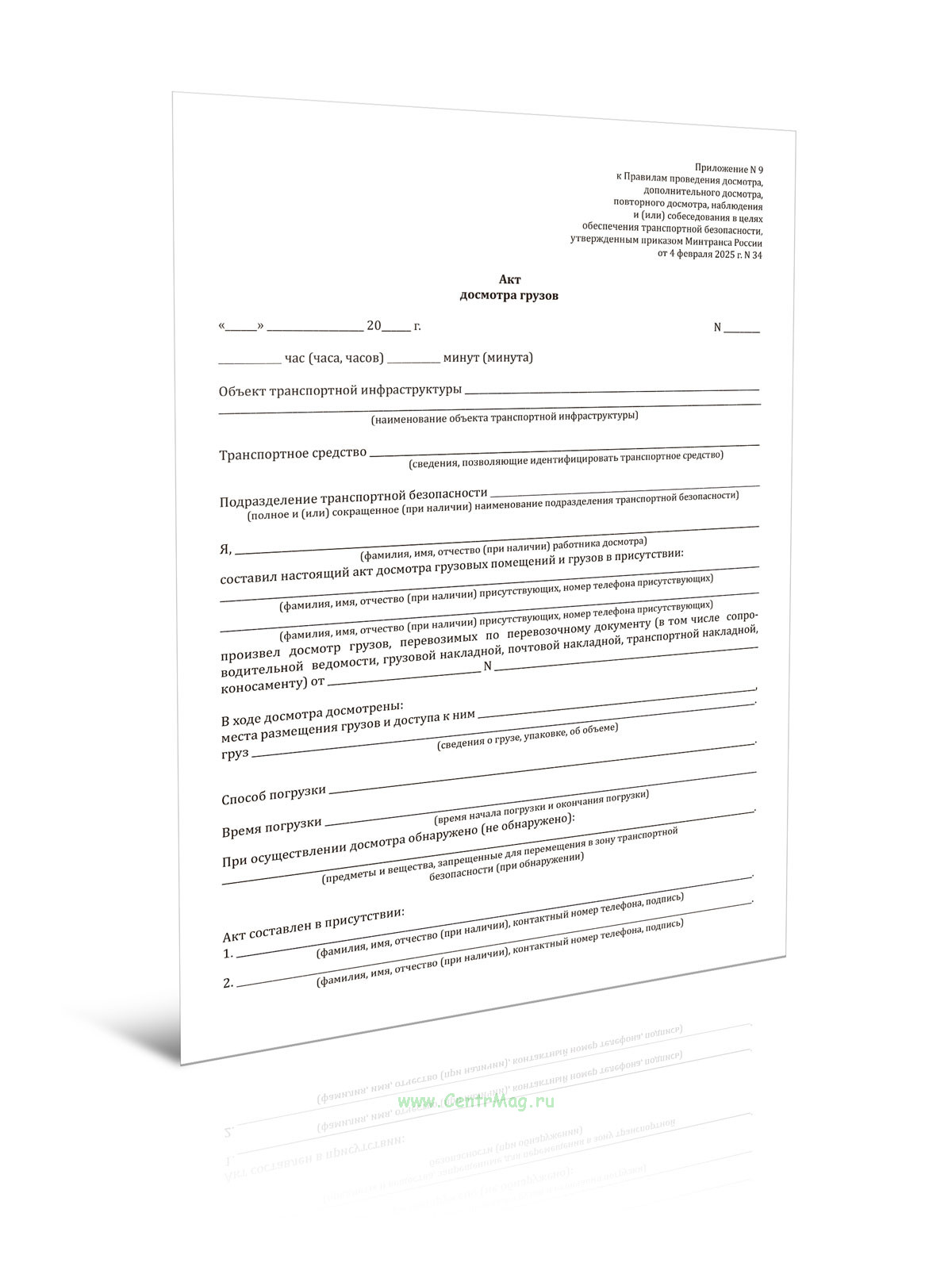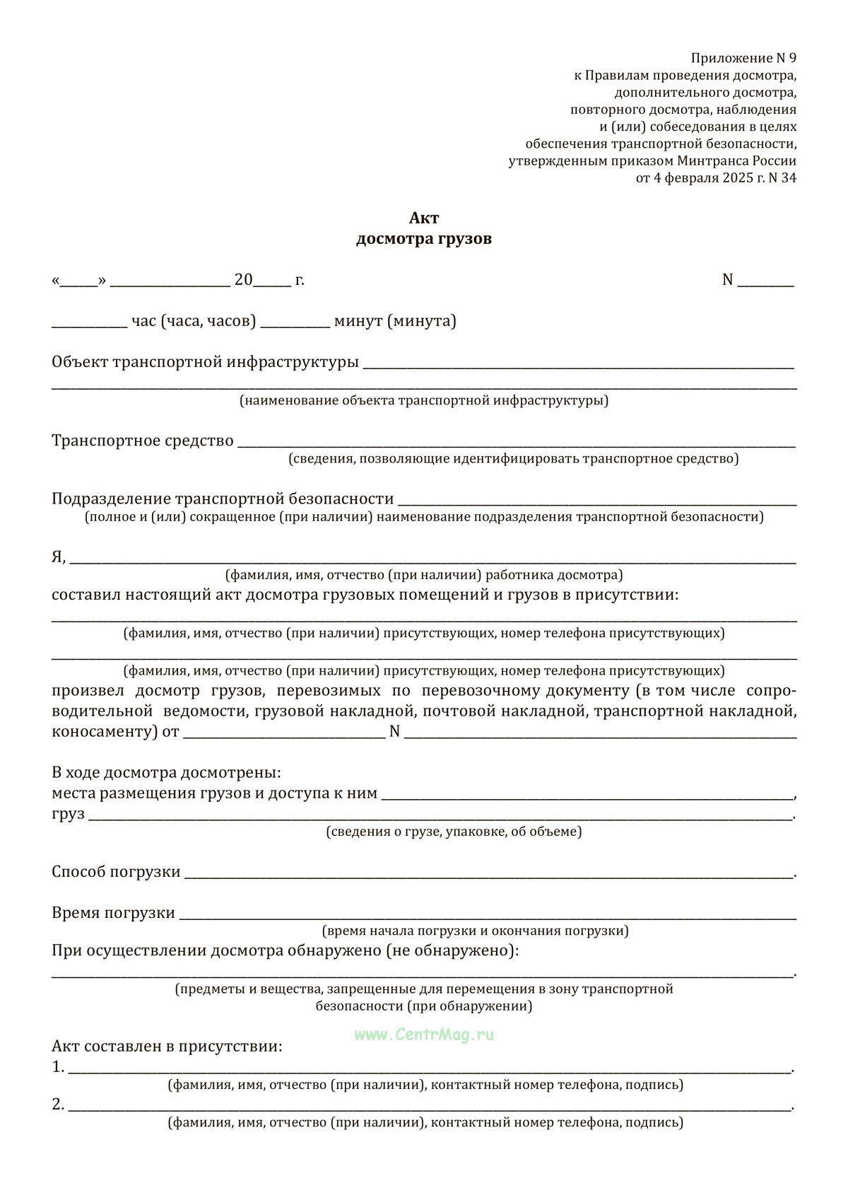 Форма Акта досмотра грузов соответствует приложению N 9 к Правилам проведения досмотра, дополнительного досмотра, повторного досмотра, наблюдения и(или)собеседования в целях обеспечения транспортной безопасности, утвержденным приказом Минтранса России от 4 февраля 2025 г. N 34