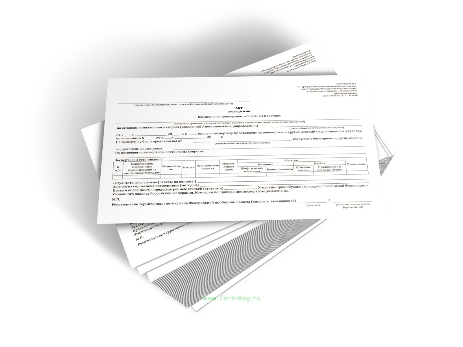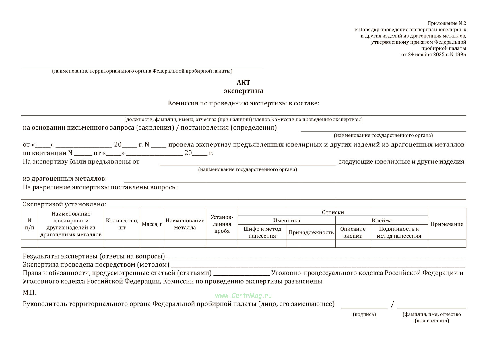 Форма Акта экспертизы соответствует Приложению N 2 к Приказу Федеральной пробирной палаты от 24.11.2025 N 189н "Об утверждении Порядка проведения экспертизы ювелирных и других изделий из драгоценных металлов"