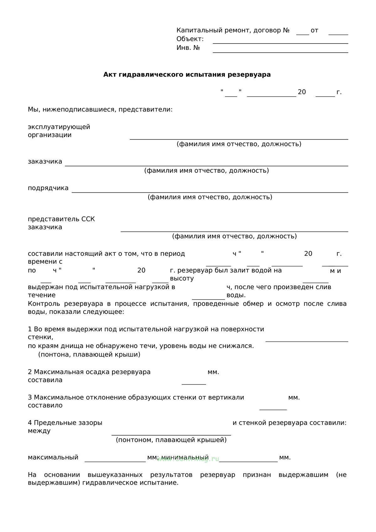 Акт гидравлического испытания резервуара (Форма Д.35)