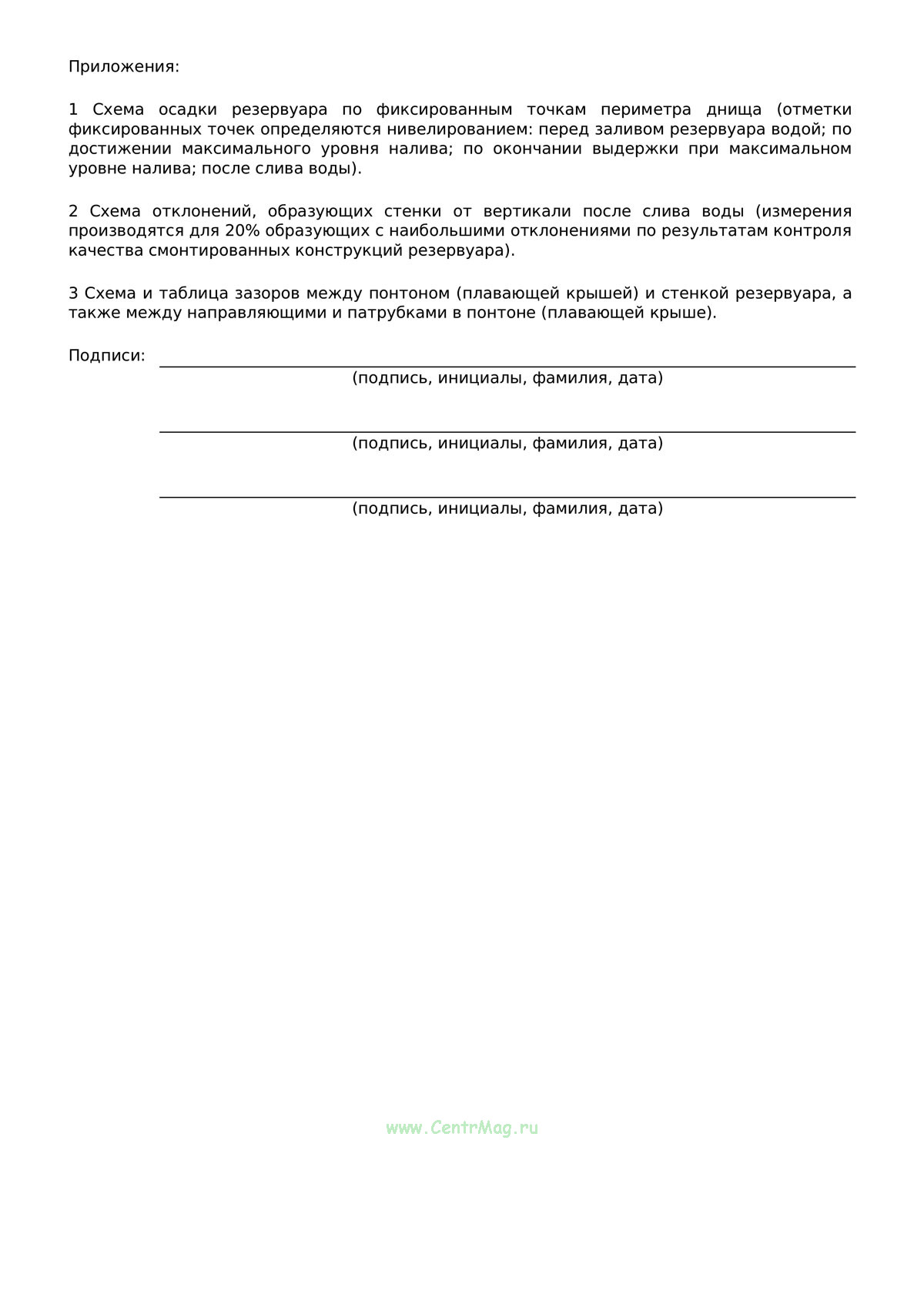 Акт применяется для документального подтверждения герметичности и прочности конструкций резервуара при заполнении его водой и выдержке под испытательной нагрузкой. Он фиксирует отсутствие течей, величины осадки, отклонения стенок, предельные зазоры и результаты замеров, служа основанием для признания резервуара прошедшим испытание и готовым к эксплуатации.