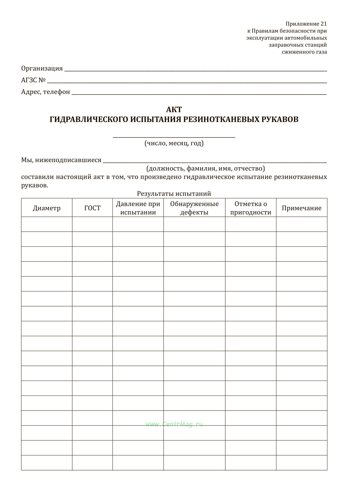 Форма акта гидравлического испытания резинотканевых рукавов автомобильной газозаправочной станции соответствует Приложению 21 к Правилам безопасности при эксплуатации автомобильных заправочных станций сжиженного газа ПБ 12-527-03, которые утратили силу.