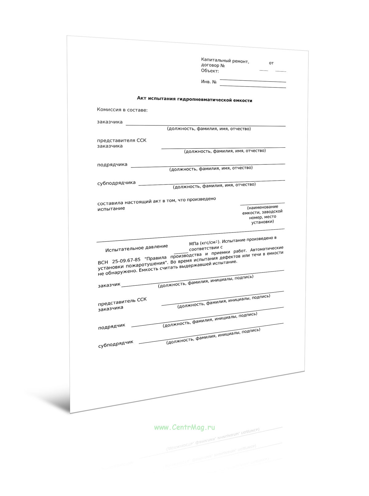 Акт испытания гидропневматической емкости (Форма Д.77)