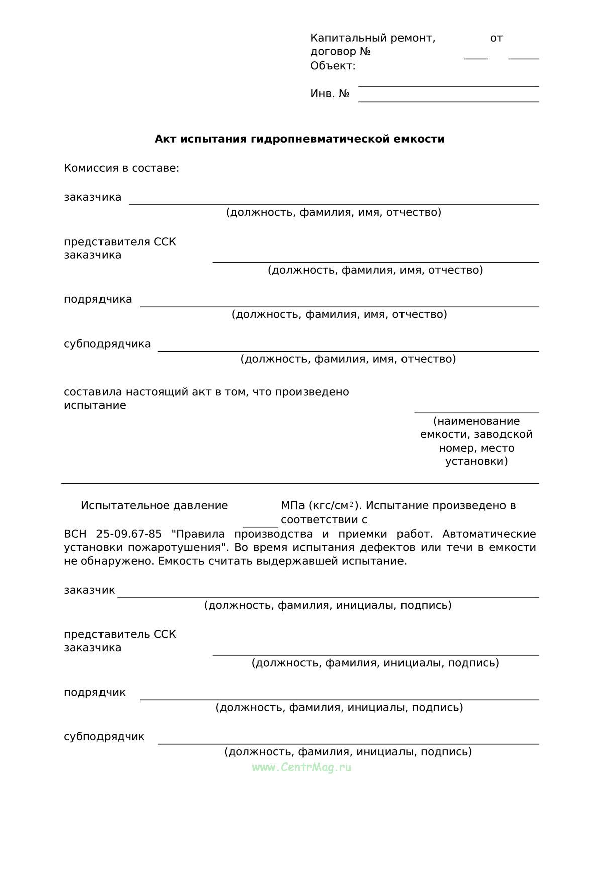 Акт предназначен для фиксации результатов проверки прочности и герметичности ёмкости, применяемой, в системах автоматического пожаротушения. В документе указывается наименование и место установки ёмкости, испытательное давление, нормативный документ, в соответствии с которым проводилось испытание. Фиксируется отсутствие дефектов и течей. Акт подтверждает, что ёмкость выдержала испытание и может быть допущена к эксплуатации. Подписывается представителями заказчика, подрядчика, субподрядчика и службы строительного контроля.