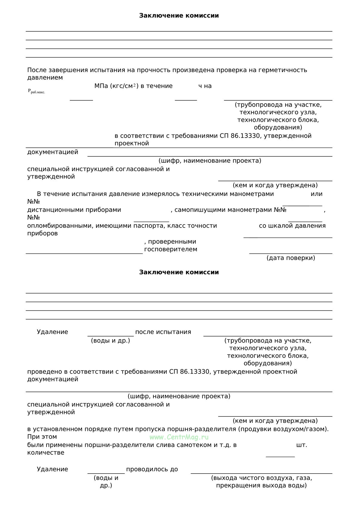 Акт предназначен для официального подтверждения выполнения испытаний трубопроводов, технологических узлов или оборудования на устойчивость к внутреннему давлению. В документе отражаются параметры испытания, включая давление в верхней и нижней точках, продолжительность выдержки, тип и состояние измерительной аппаратуры. Также фиксируются данные проектной и нормативной документации, по которым выполнялись испытания, и оформляется заключение комиссии о соответствии конструкции требованиям прочности. Этот акт дополняется проверкой герметичности и протоколом удаления среды после испытания.