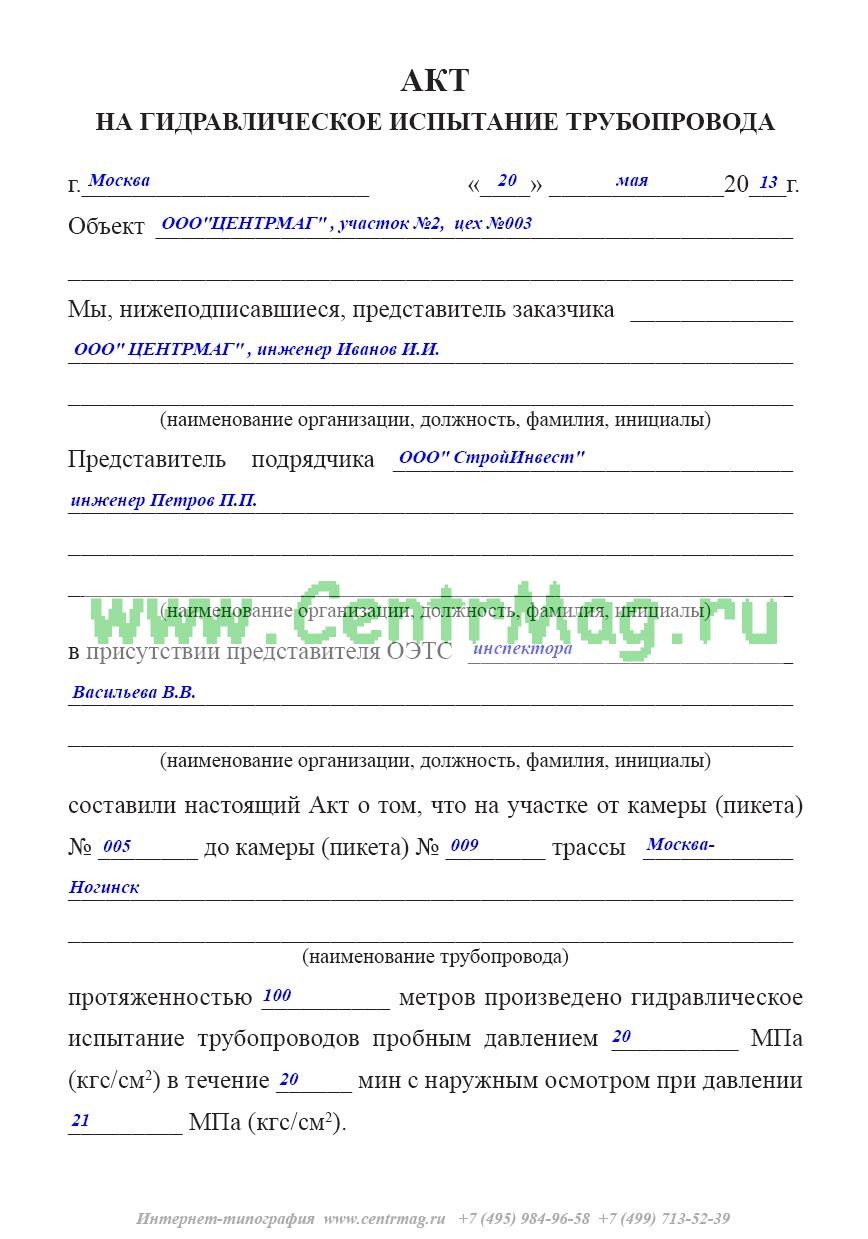 Форма акта на гидравлическое испытание трубопровода соответствует приложению 12 к РД 153-34.0-20.507-98 Типовая инструкция по технической эксплуатации систем транспорта и распределения тепловой энергии (тепловых сетей)