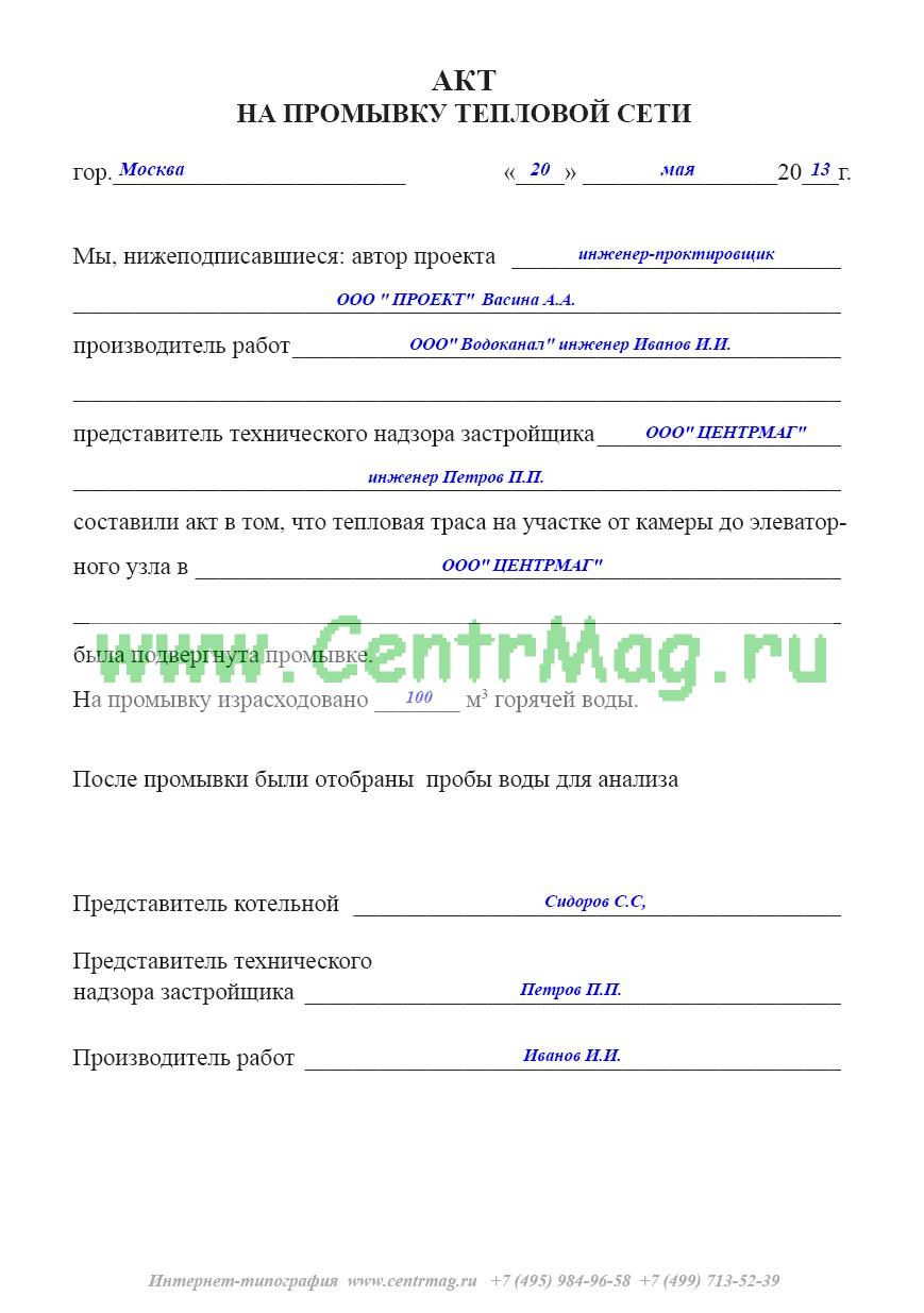 При проведении промывки тепловой сети с целью очистки внутренней поверхности труб от случайно попавших в трубы строительного мусора, песка, грязи, ржавчины, окалины и т.п. составляется акт.