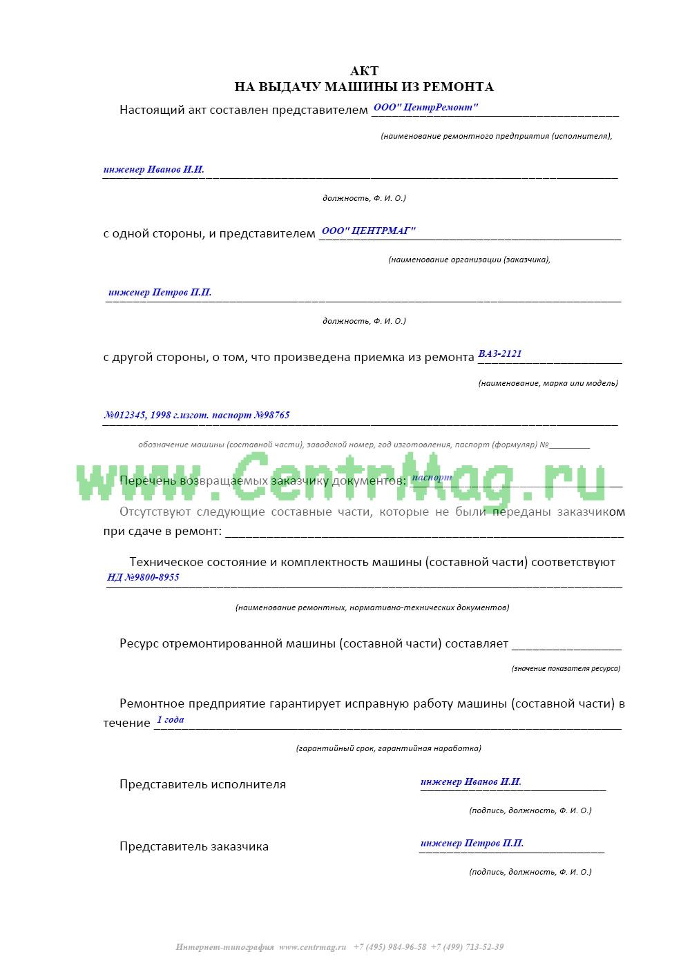 Образец и пример заполнения акта на выдачу машины из ремонта
