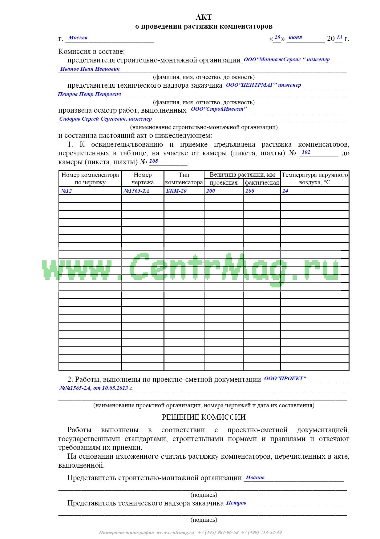 Образец и пример заполнения акта о проведении растяжки компенсаторов