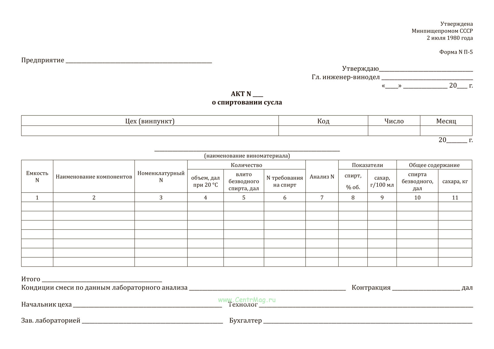 Акт о спиртовании сусла (форма № П-5) для учета израсходованного сырья и выхода виноматериалов после спиртования составляет винодел в двух экземплярах (для бухгалтерии и цеха); подписывают его начальник цеха, заведующий лабораторией, технолог и бухгалтер; утверждает - главный инженер