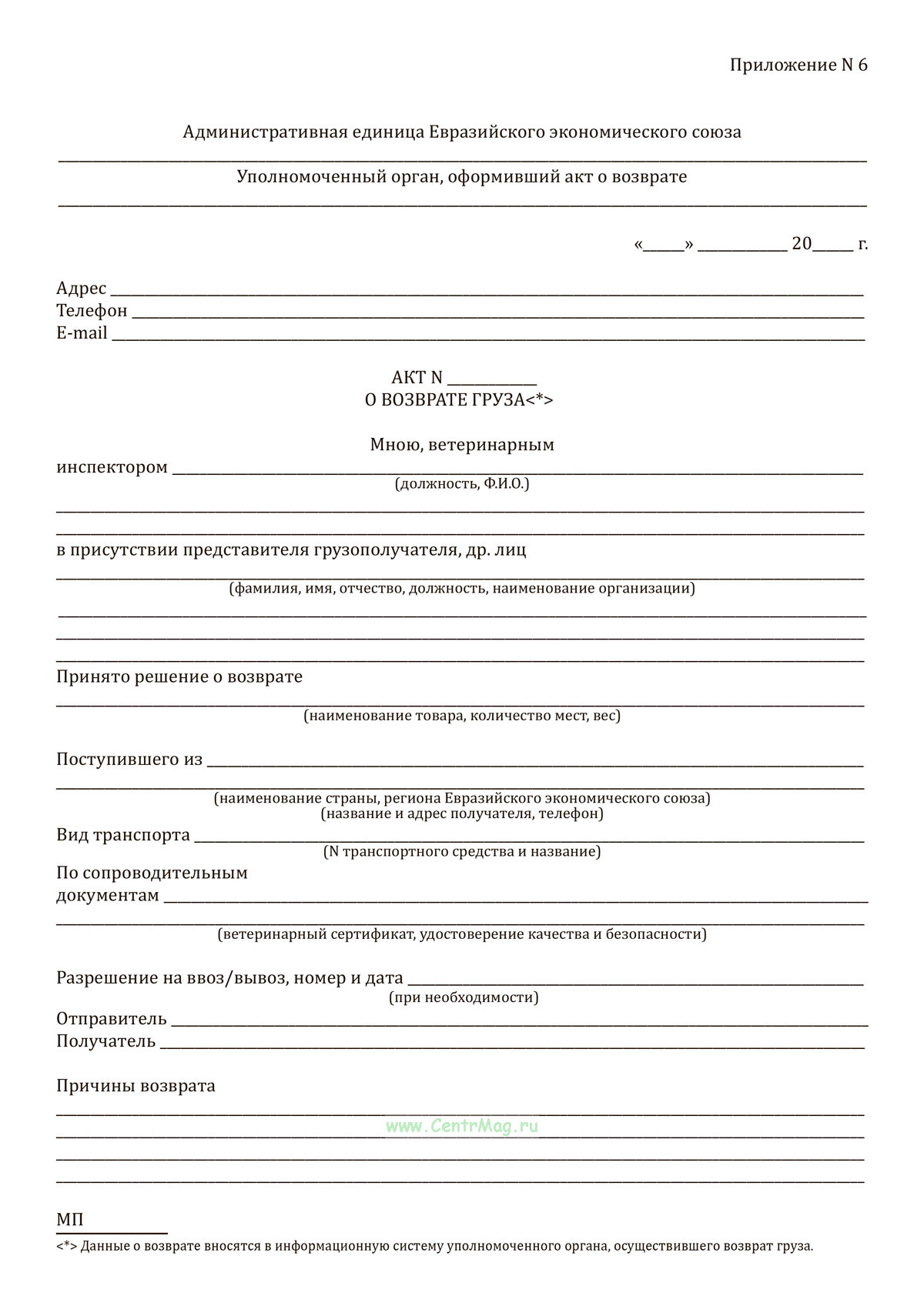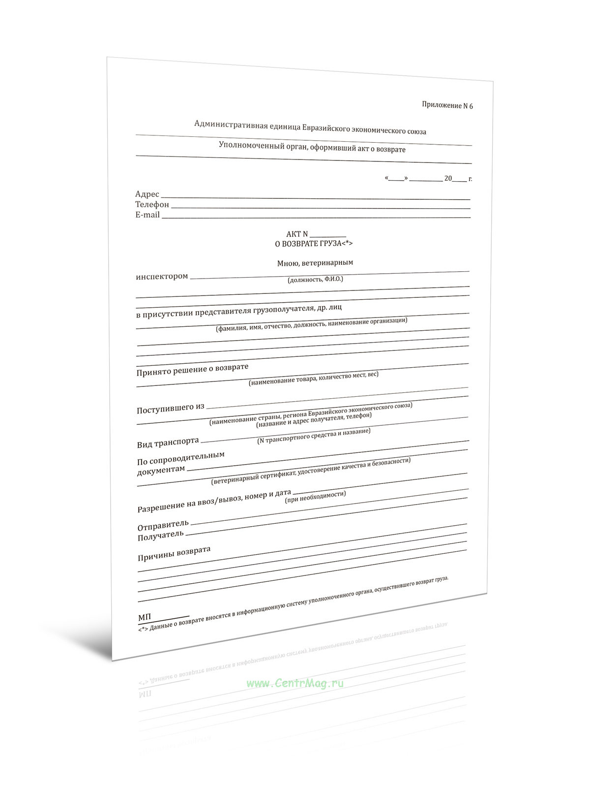Форма Акта о возврате груза соответствует Приложению N 6 к Решению Комиссии Таможенного союза от 18.06.2010 N 317 "О применении ветеринарно-санитарных мер в Евразийском экономическом союзе" (вместе с "Положением о едином порядке осуществления ветеринарного контроля (надзора) на таможенной границе Евразийского экономического союза и на таможенной территории Евразийского экономического союза", "Едиными ветеринарными (ветеринарно-санитарными) требованиями, предъявляемые к товарам, подлежащим ветеринарному контролю (надзору)")
