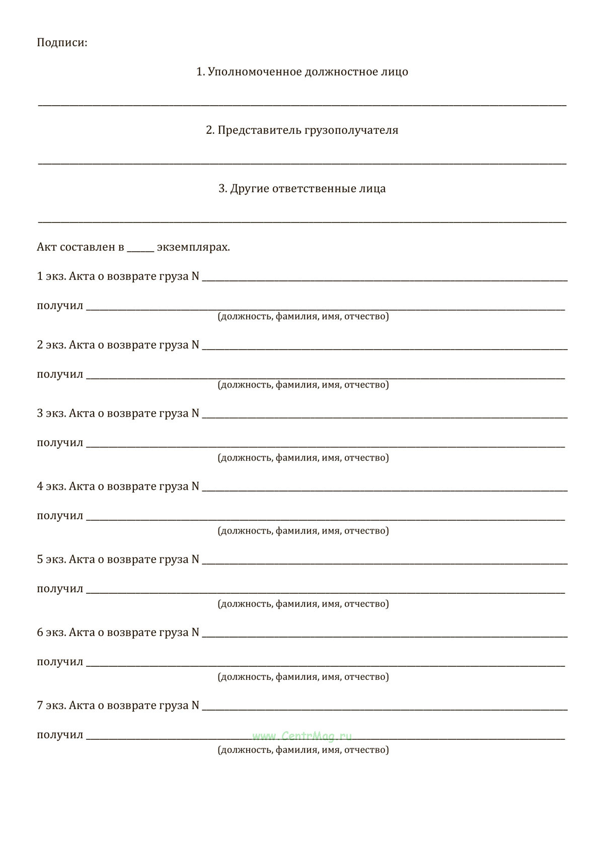 Применяется для оформления акта о возврате груза, если товар не соответствует ветеринарно-санитарным требованиям или по другим причинам. В нем указываются причины возврата, информация о товаре, транспортировке и сторонах, участвующих в процессе