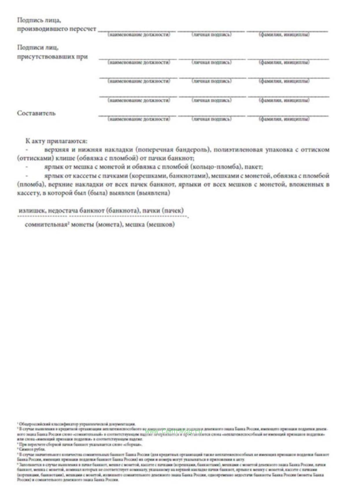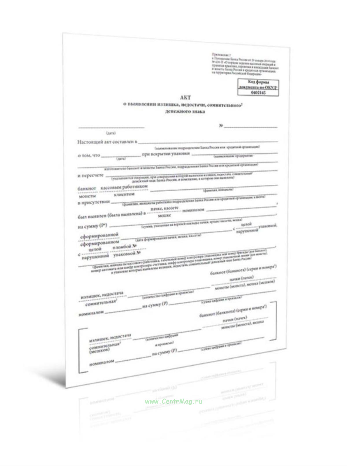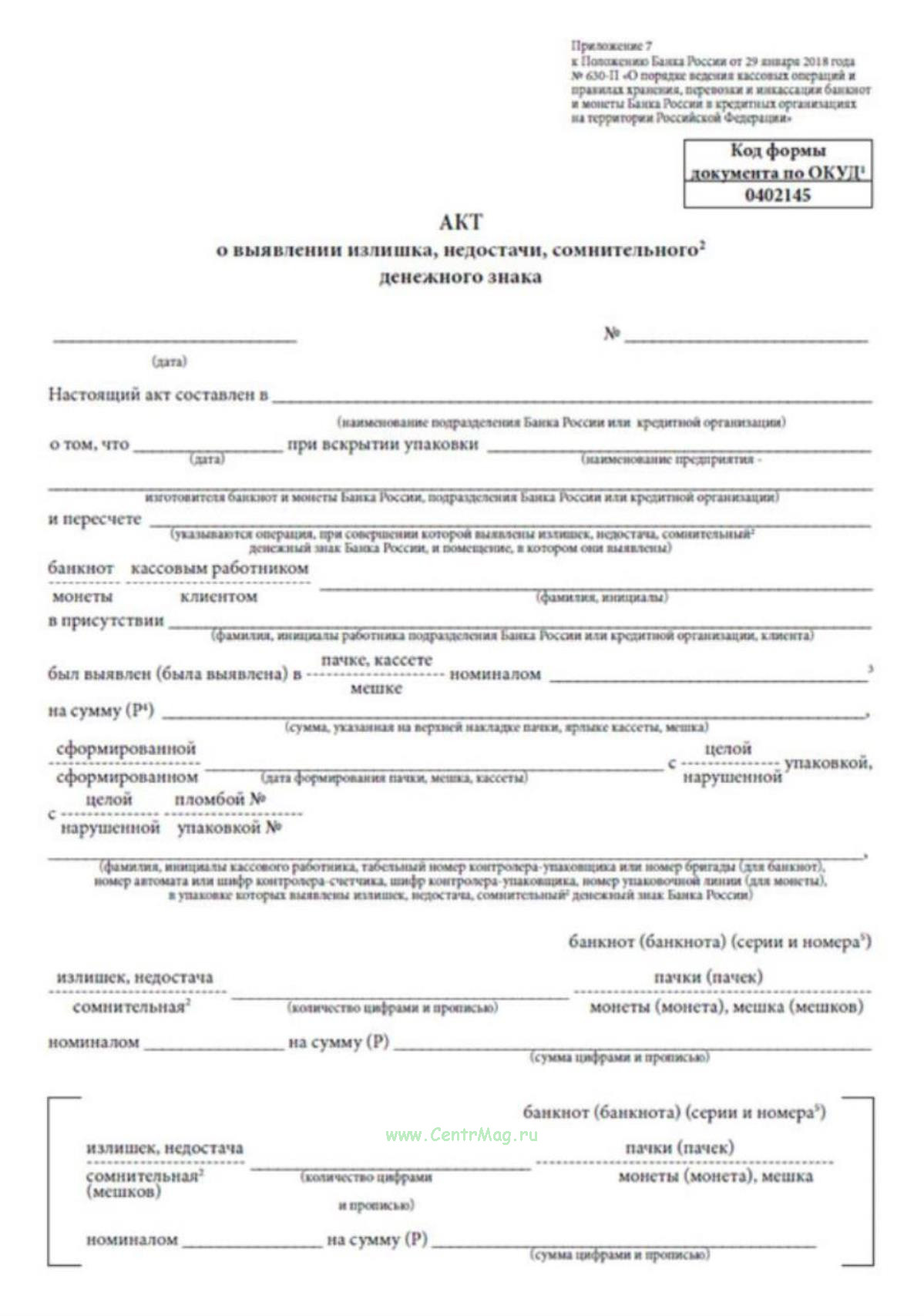 Форма акта о выявлении излишка, недостачи, сомнительного денежного знака (ОКУД 0402145) соответствует Приложению 7 к Положению о порядке ведения кассовых операций и правилах хранения, перевозки и инкассации банкнот и монеты Банка России в кредитных организациях на территории Российской Федерации (утв. Банком России 29.01.2018 № 630-П).