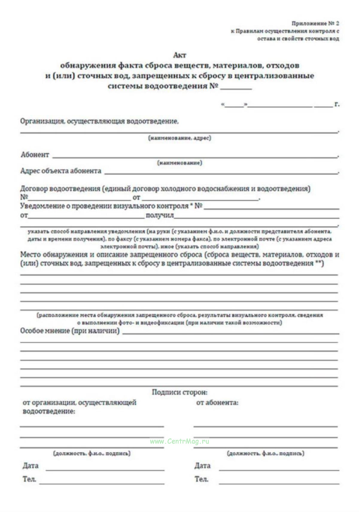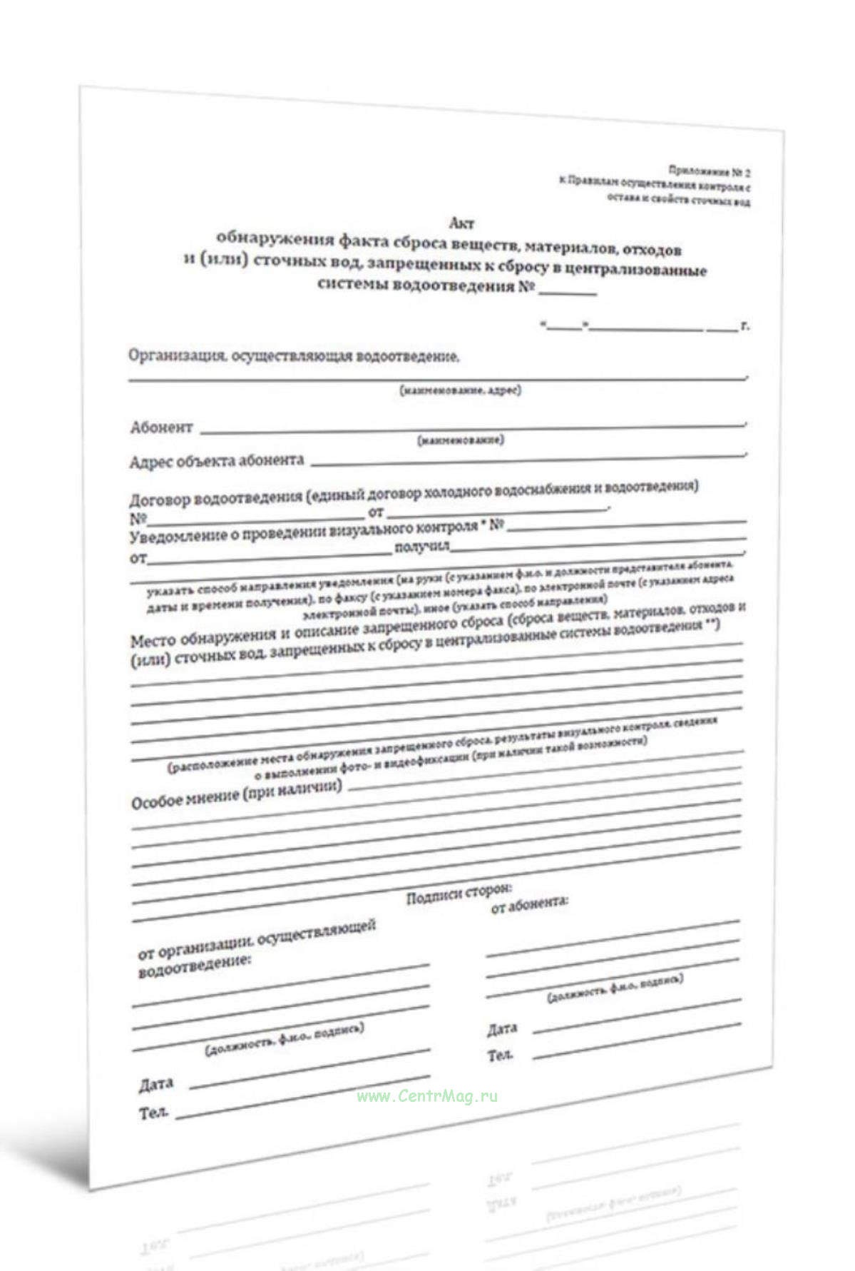 Акт обнаружения факта сброса веществ, материалов, отходов и (или) сточных вод, запрещенных к сбросу в централизованные системы водоотведения
