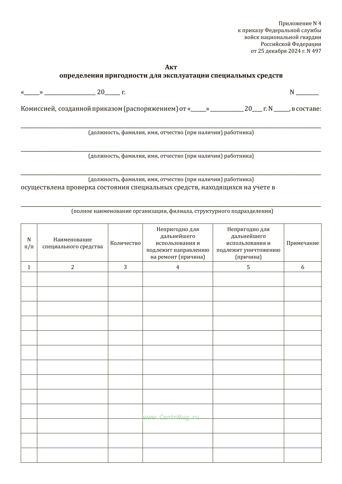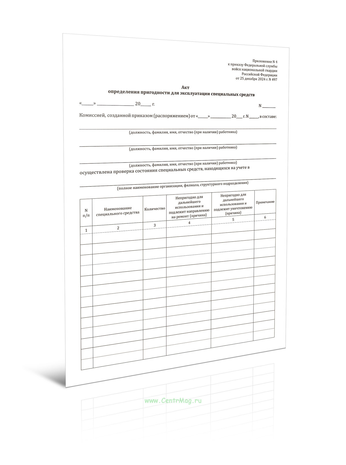 Форма Акта определения пригодности для эксплуатации специальных средств соответствует Приложению № 4 к Приказу Росгвардии от 25.12.2024 N 497 "Об утверждении перечней, форм и порядков ведения документов, оформляемых ведомственной охраной федеральных государственных органов, федеральных органов исполнительной власти, высшего исполнительного органа субъекта Российской Федерации - города федерального значения Москвы, организаций, имеющих в соответствии с законодательством Российской Федерации право на создание ведомственной охраны, при приобретении, учете, передаче (возврате) специальных средств, а также публичным акционерным обществом "Сбербанк России" при передаче специальных средств"