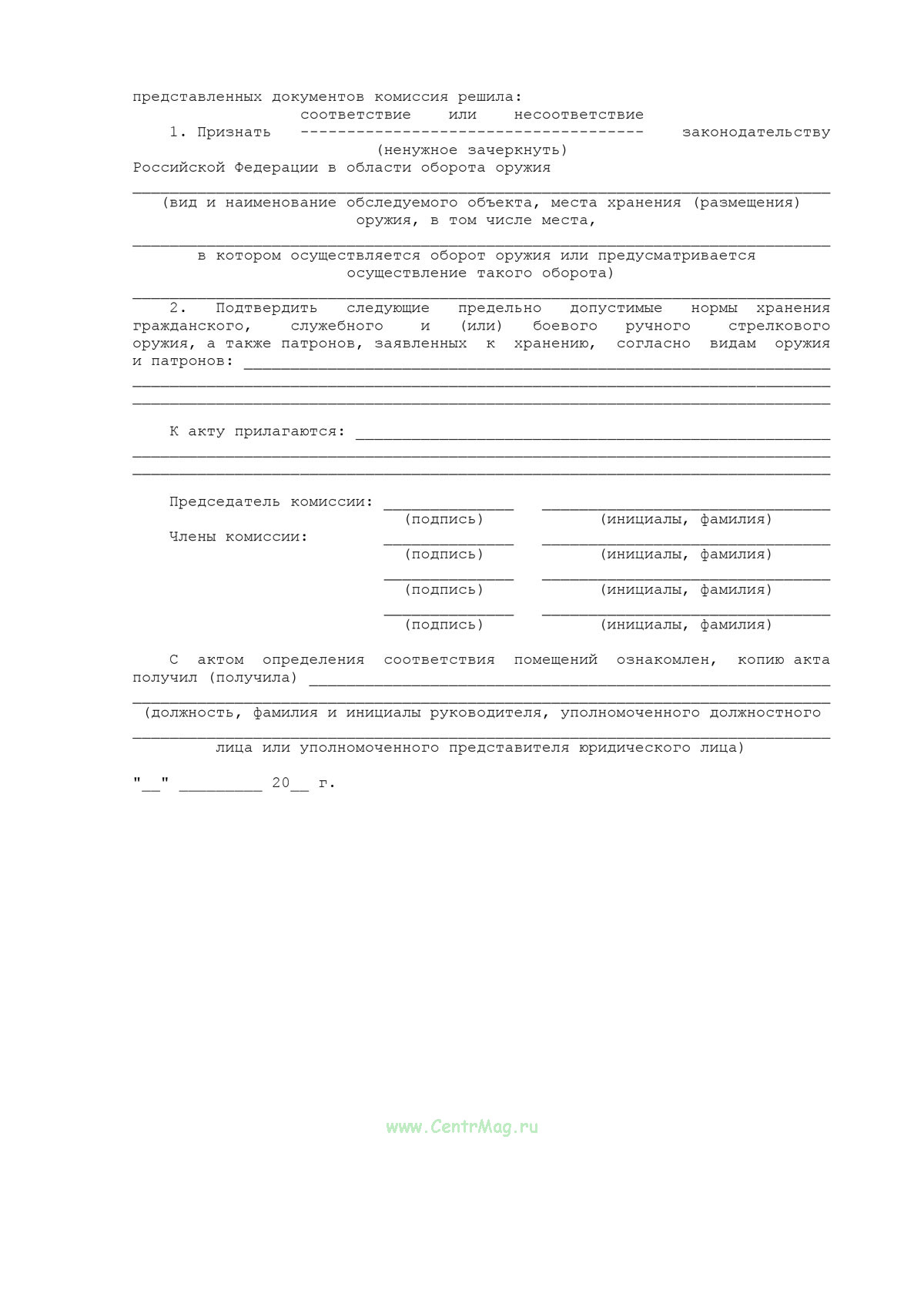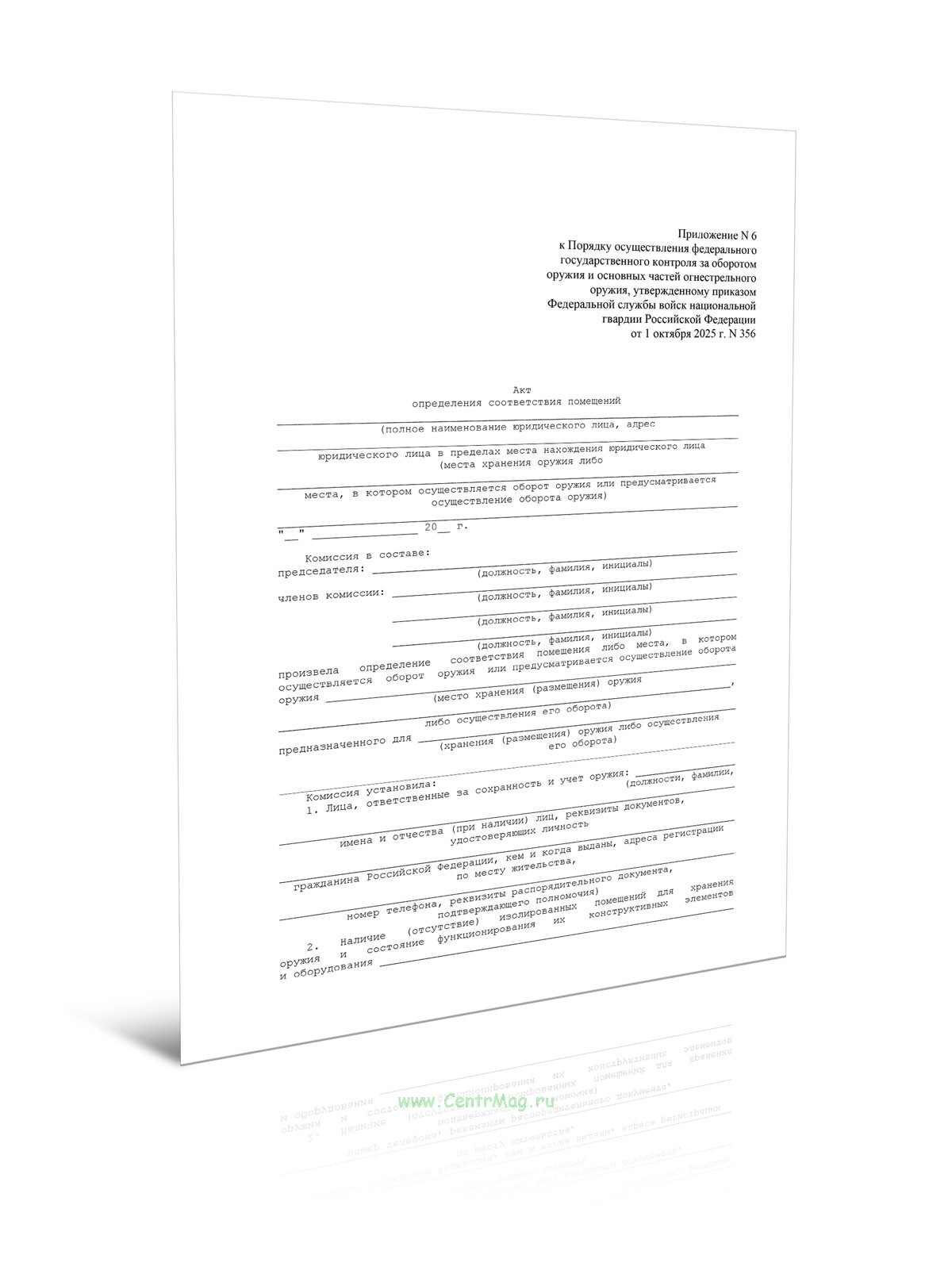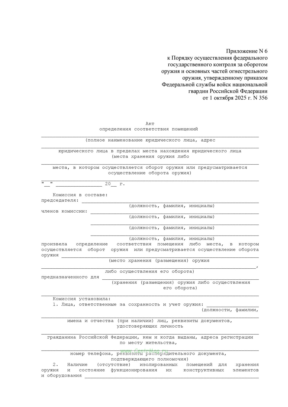 Форма Акта определения соответствия помещений соответствует Приложению 6 к Приказу Росгвардии от 01.10.2025 N 356 "Об утверждении Порядка осуществления федерального государственного контроля за оборотом оружия и основных частей огнестрельного оружия"