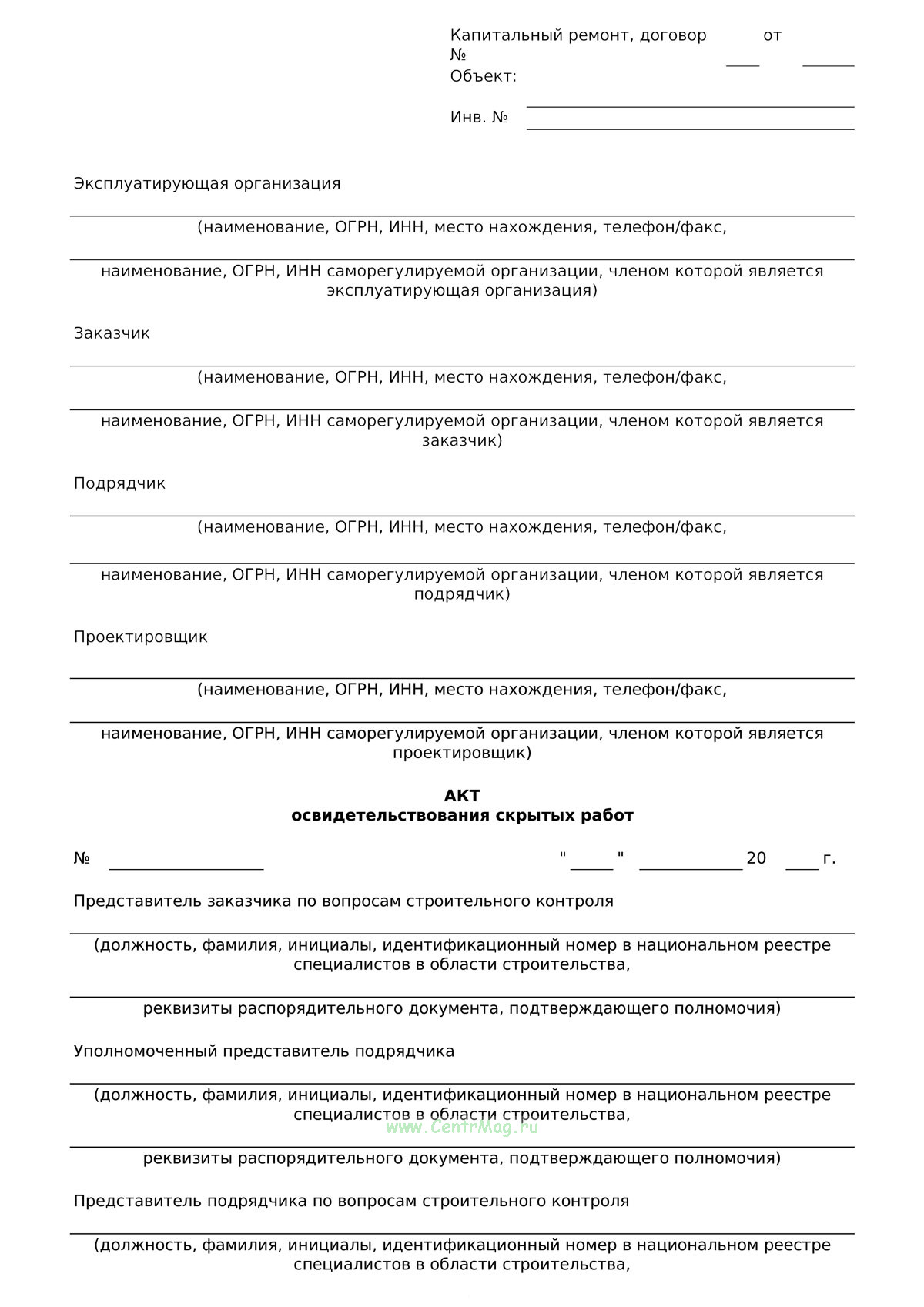 Форма Акта освидетельствования скрытых работ соответствует Приложению Д. 8 к СТО Газпром 28.5-019-2025 "Исполнительная документация при ремонте"