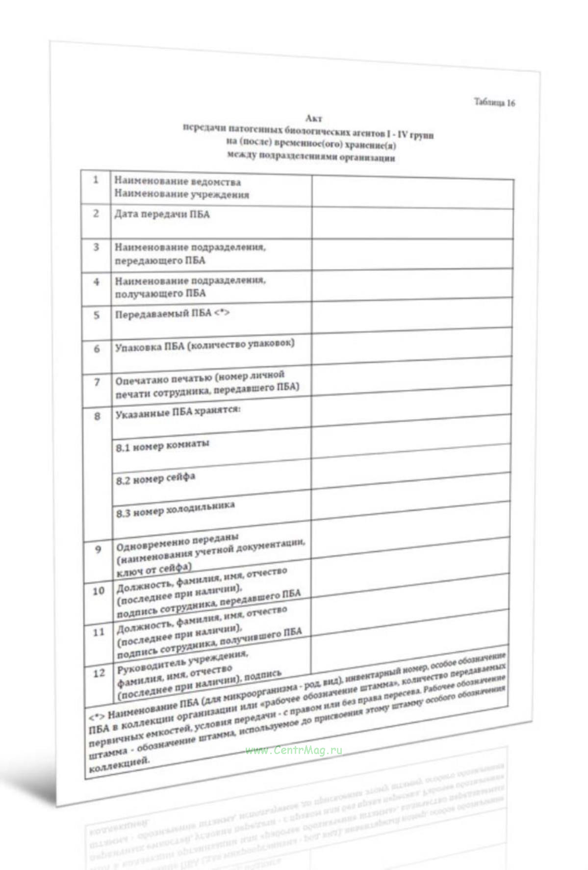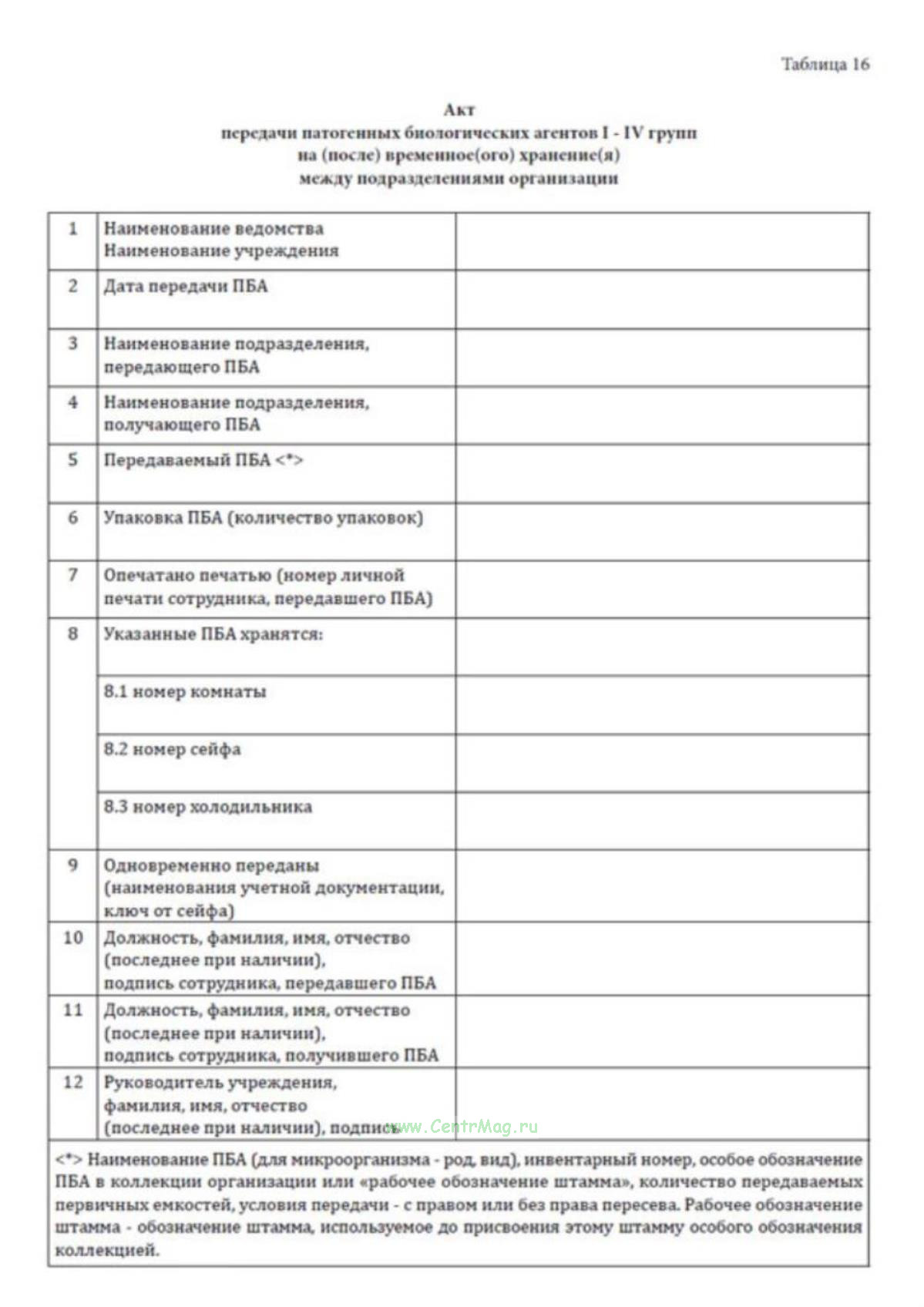 Передача патогенных биологических агентов I-IV групп патогенности на (после) временное (ого) хранение (я) между подразделениями организации производится с оформлением акта.
