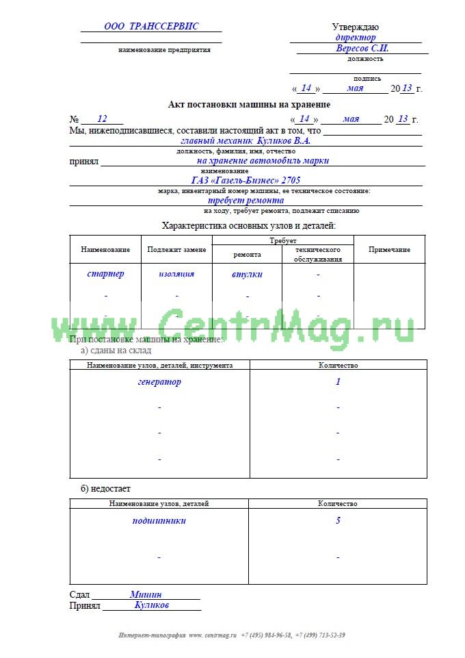 Прием машин на хранение и выдача их с хранения оформляется приемосдаточными актами или записью в журнале учета.