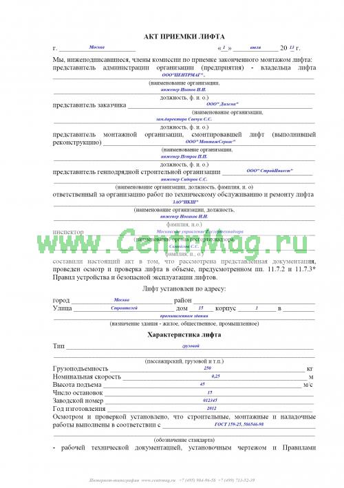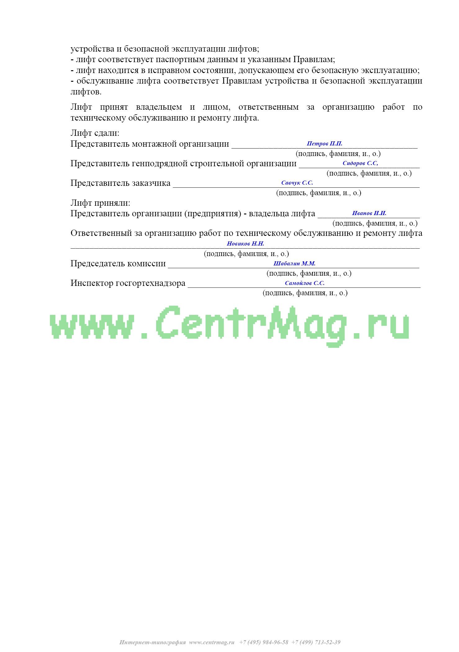 При приемке лифта в эксплуатацию в обязательном порядке составляют акт приемки лифта в эксплуатацию, а также акт технической готовности и приемки лифта.