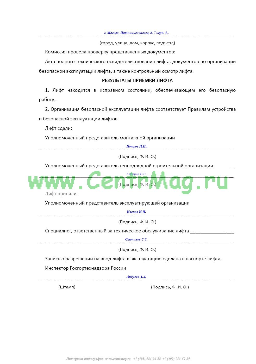 Результаты освидетельствования отражаются в акте полного технического освидетельствования лифта и паспорте лифта, заверяются подписью и штампом специалиста экспертной организации.