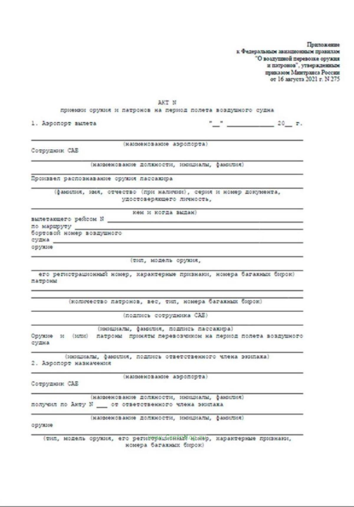 Форма Акта приемки оружия и патронов на период полета воздушного судна соответствует Приложению к Приказу Минтранса России от 16.08.2021 N 275 "Об утверждении Федеральных авиационных правил "О воздушной перевозке оружия и патронов".