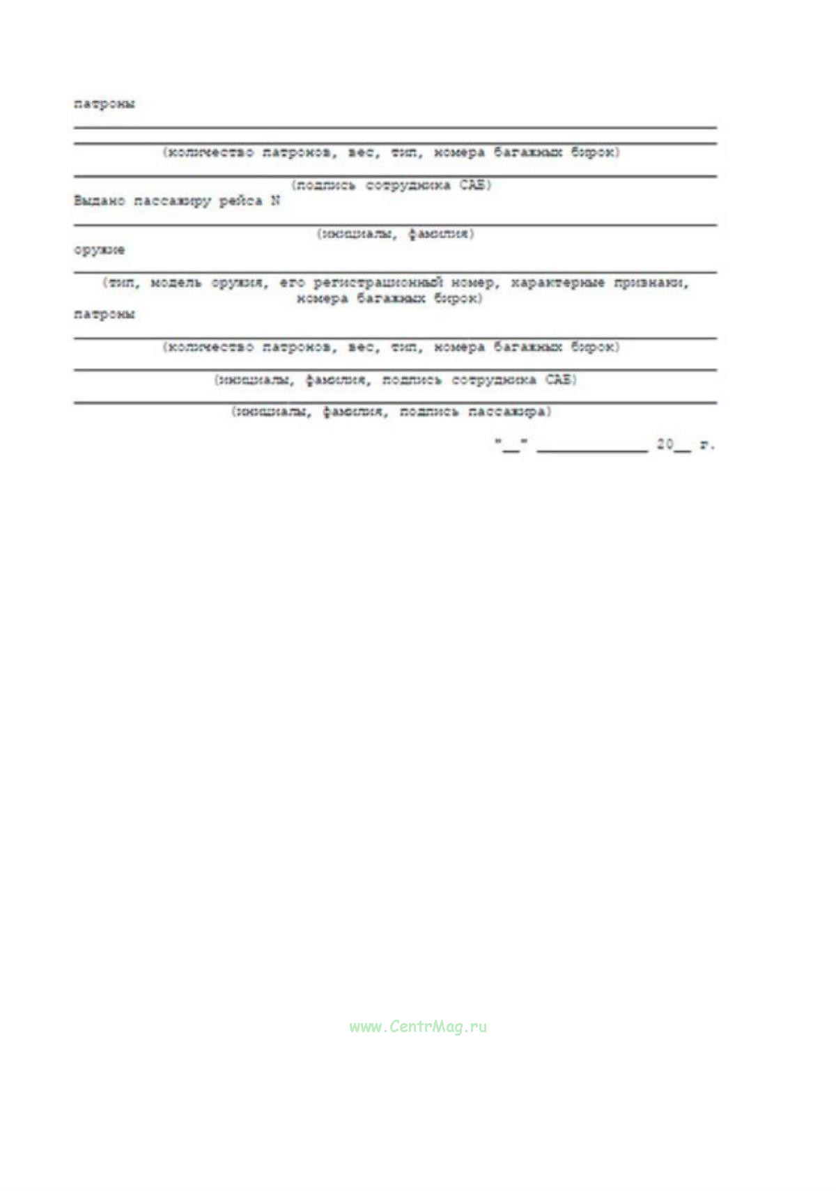 Четвертый экземпляр Акта должен выдаваться пассажиру и предъявляться им вместе с корешком багажной бирки при получении оружия в аэропорту назначения.
