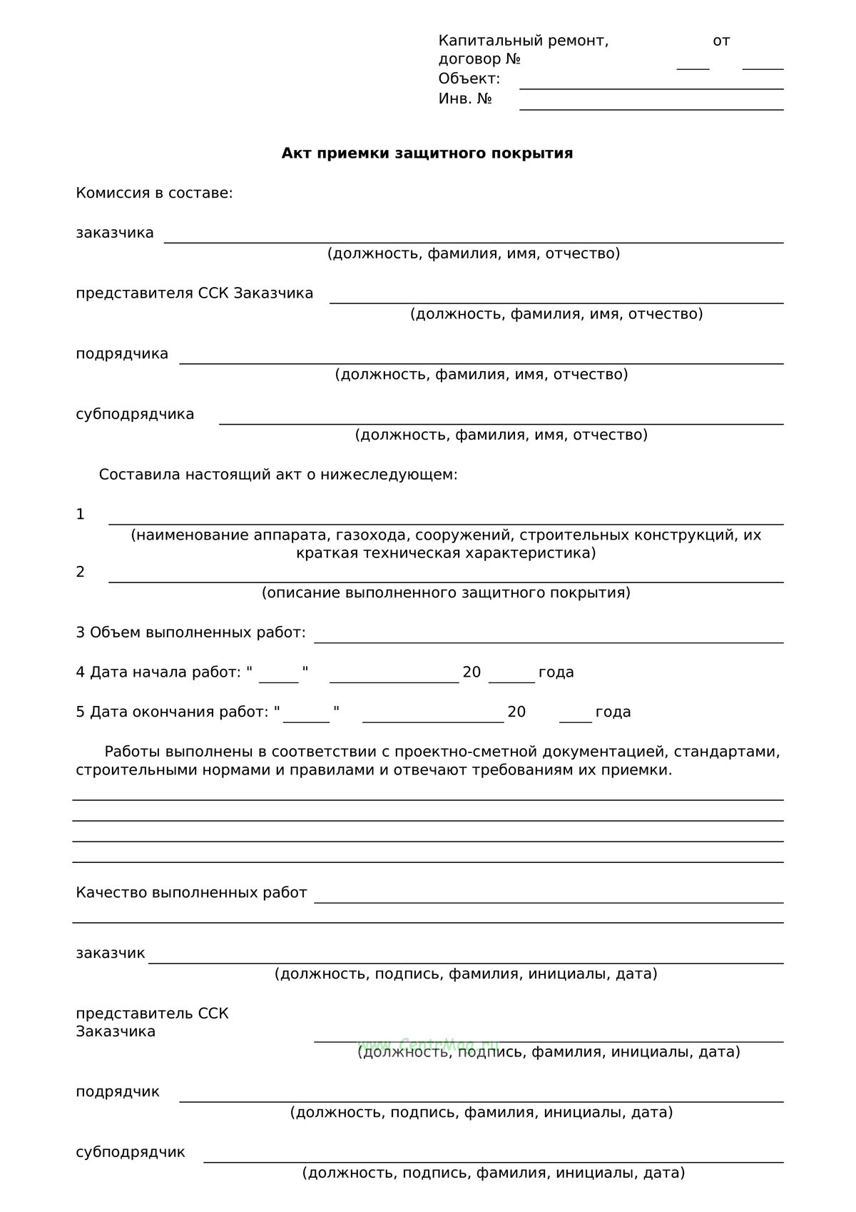 Акт предназначен для фиксации результатов выполненных работ по нанесению защитных слоёв на оборудование, конструкции или сооружения. В документе указываются наименование объекта, характеристики нанесённого покрытия, объём и сроки выполнения работ, а также вывод о соответствии работ проектной и нормативной документации. Отмечается качество выполненного покрытия и делается заключение о его приёмке. Акт подписывается представителями заказчика, подрядной и субподрядной организаций и включается в состав исполнительной документации.