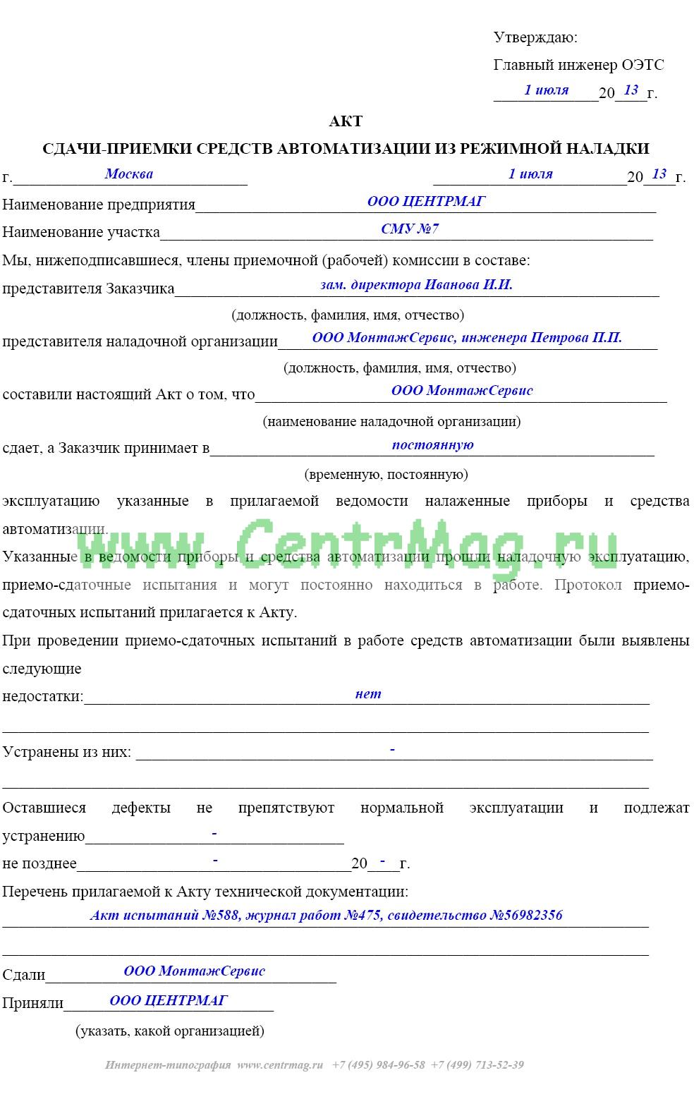Режимная наладка средств автоматизации, выполняемая специализированной наладочной организацией после отладки режима работы энергетического оборудования, и сдача их в эксплуатацию приемочной комиссии заказчика оформляется по акту сдачи-приемки средств автоматизации из режимной наладки.