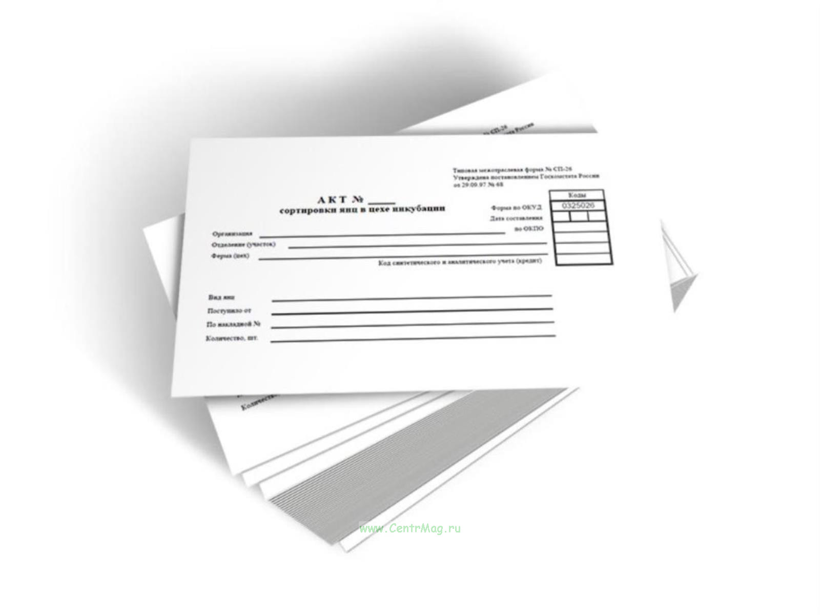 Бланк Акта сортировки яиц в цехе инкубации (Форма № СП-26) соответствует Постановлению Госкомстата РФ от 29.09.1997 № 68 "Об утверждении унифицированных форм первичной учетной документации по учету сельскохозяйственной продукции и сырья"