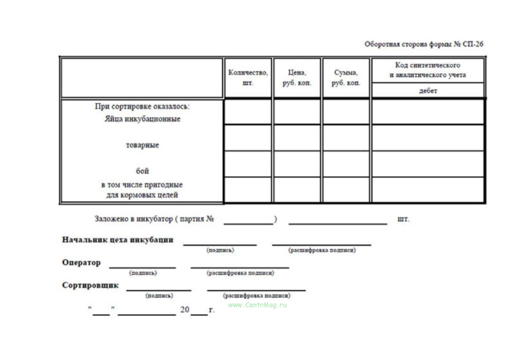 Применяется для оформления результатов сортировки яиц в цехе инкубации.