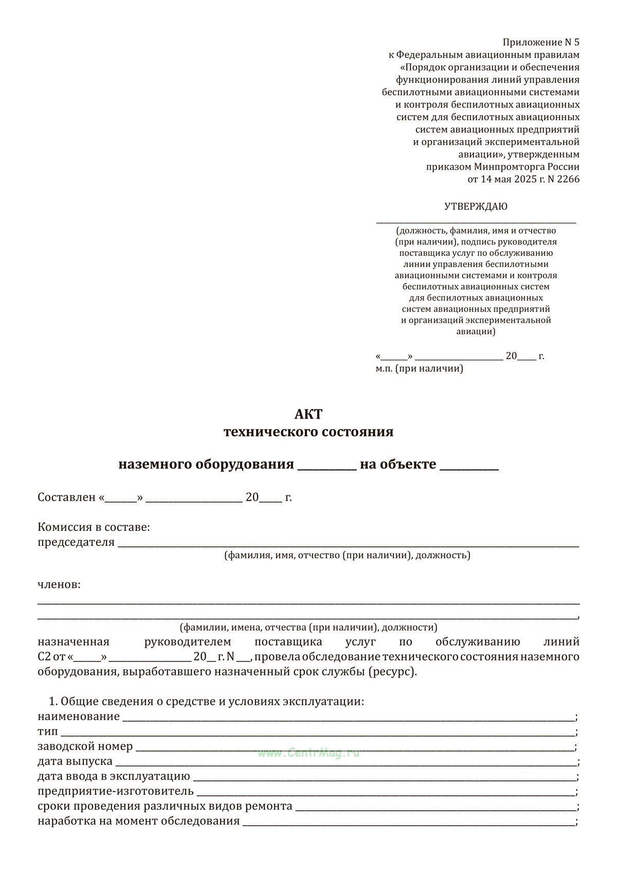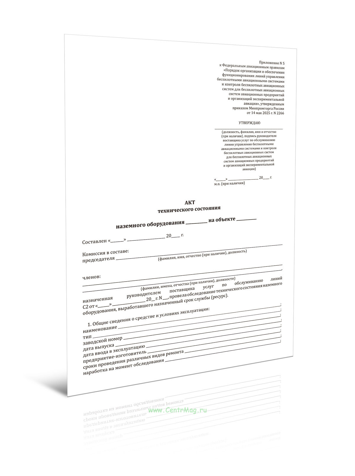 Форма Акта технического состояния соответствует Приложению N 5 к Приказу Минпромторга России от 14.05.2025 N 2266 "Об утверждении Федеральных авиационных правил "Порядок организации и обеспечения функционирования линий управления беспилотными авиационными системами и контроля беспилотных авиационных систем для беспилотных авиационных систем авиационных предприятий и организаций экспериментальной авиации"
