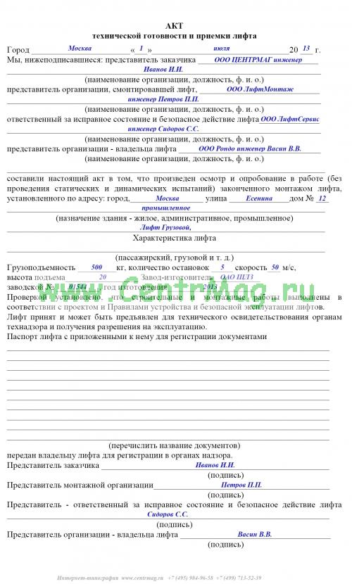 Образец и пример заполнения акта технической готовности и приемки лифта
