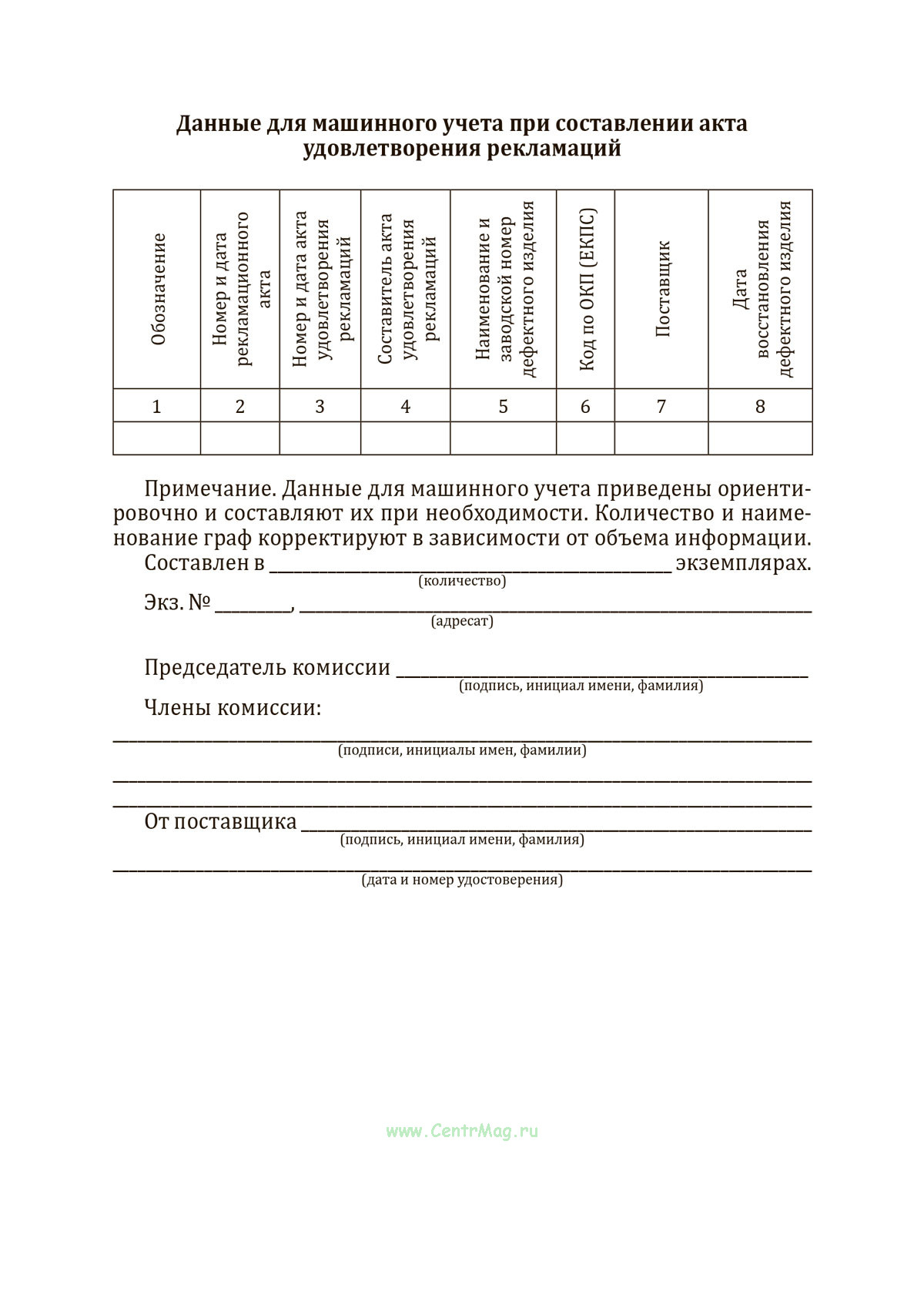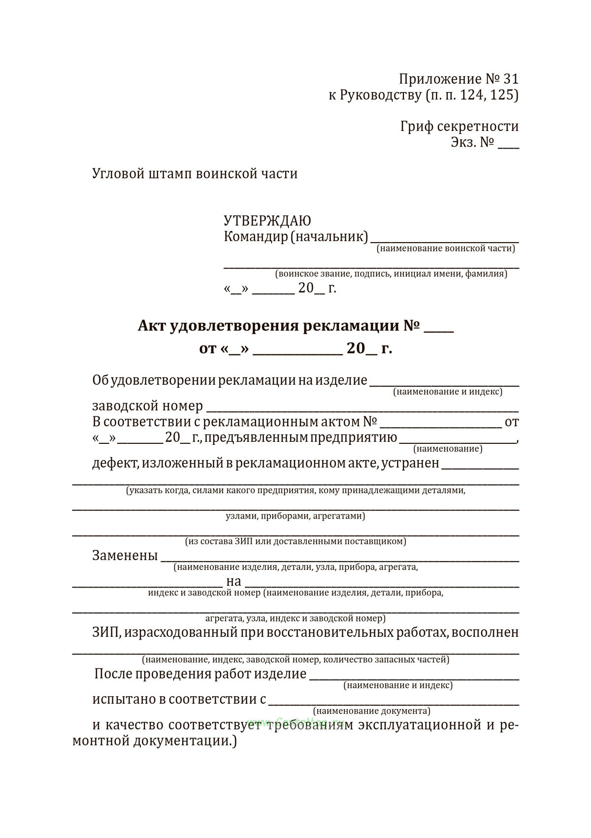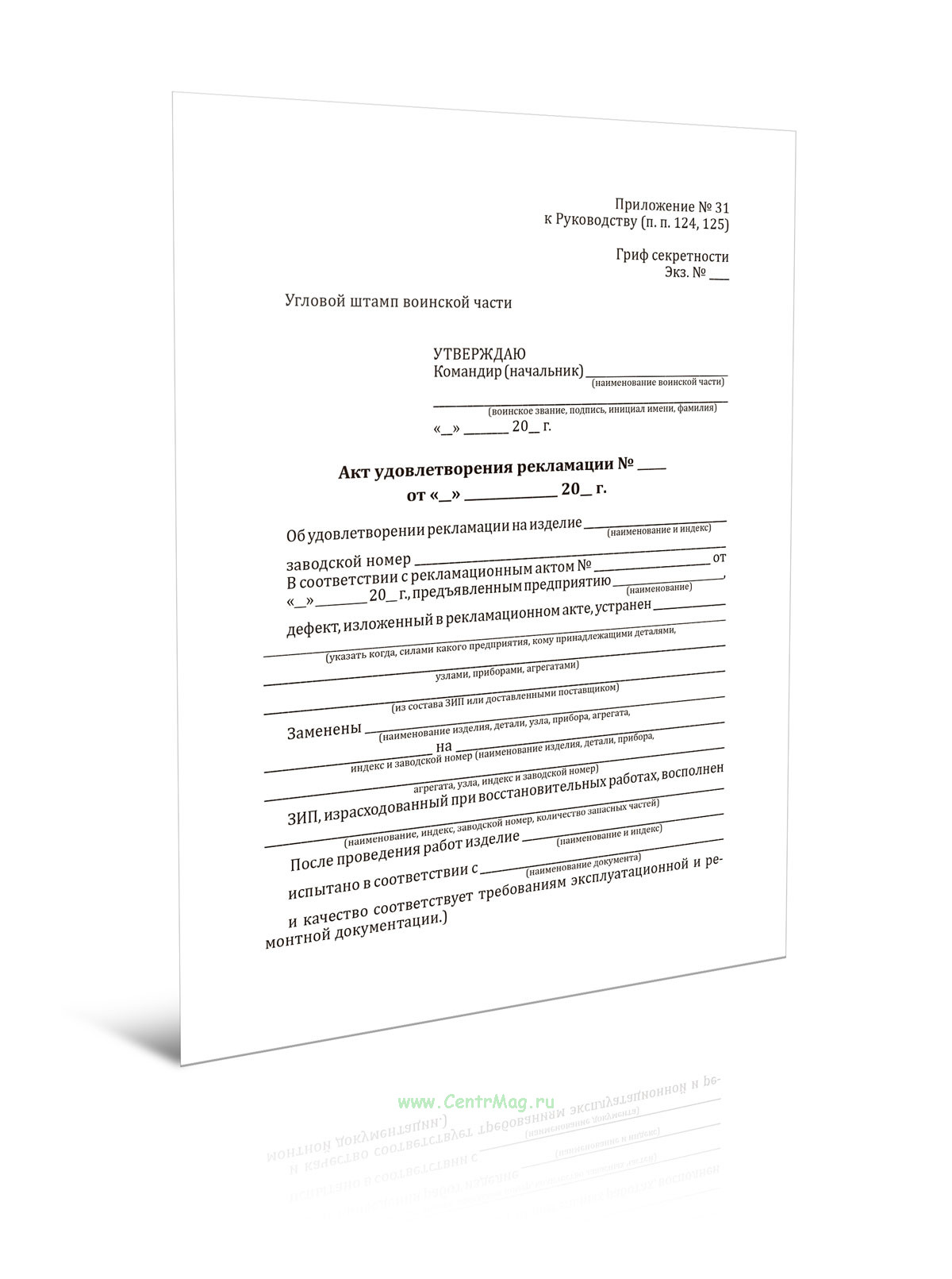 Форма Акта удовлетворения рекламации соответствует Приложению № 31 Приказу Министра обороны РФ от 28.12.2013 N 969 "Об утверждении Руководства по содержанию вооружения и военной техники общевойскового назначения, военно-технического имущества в Вооруженных Силах Российской Федерации"