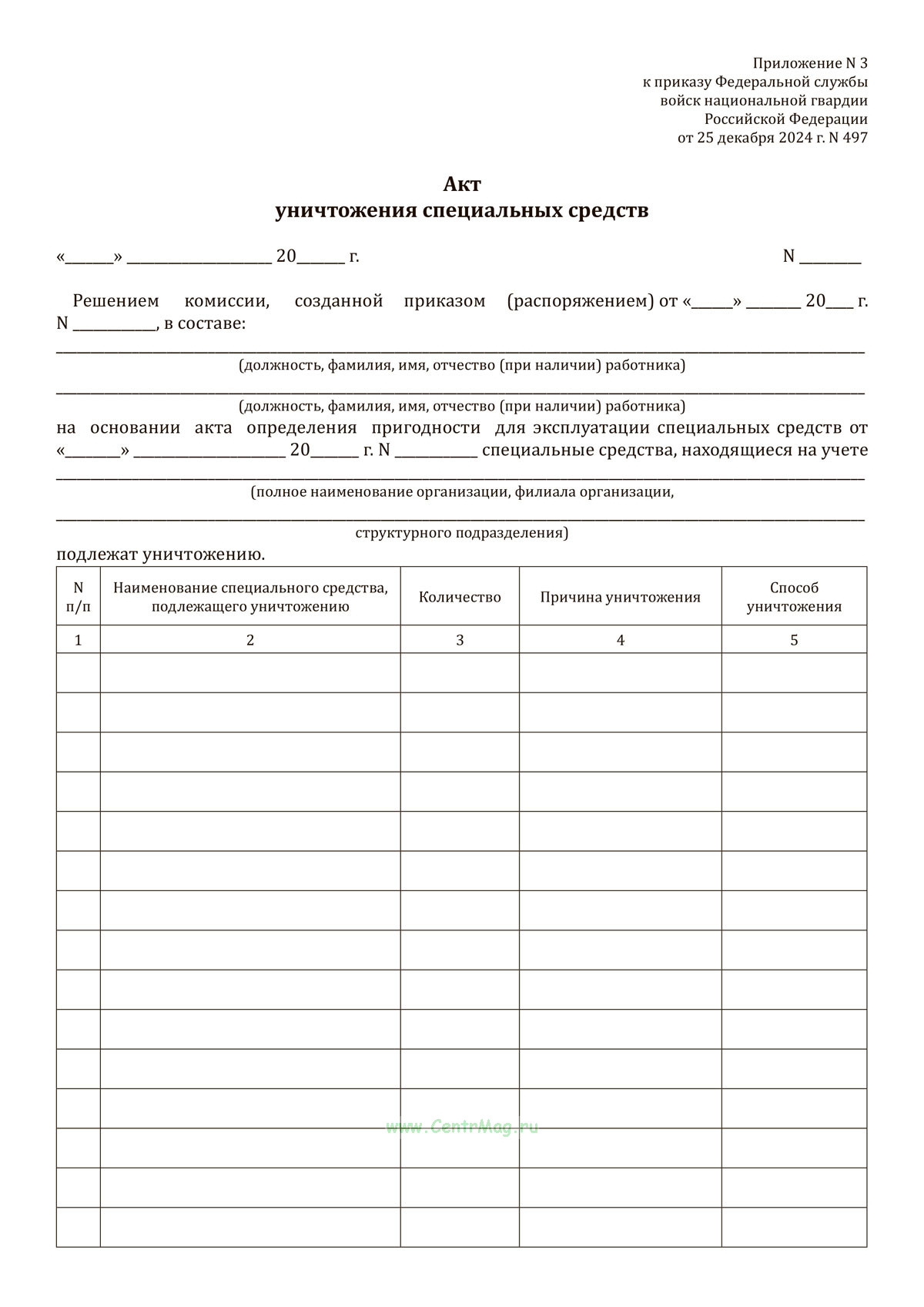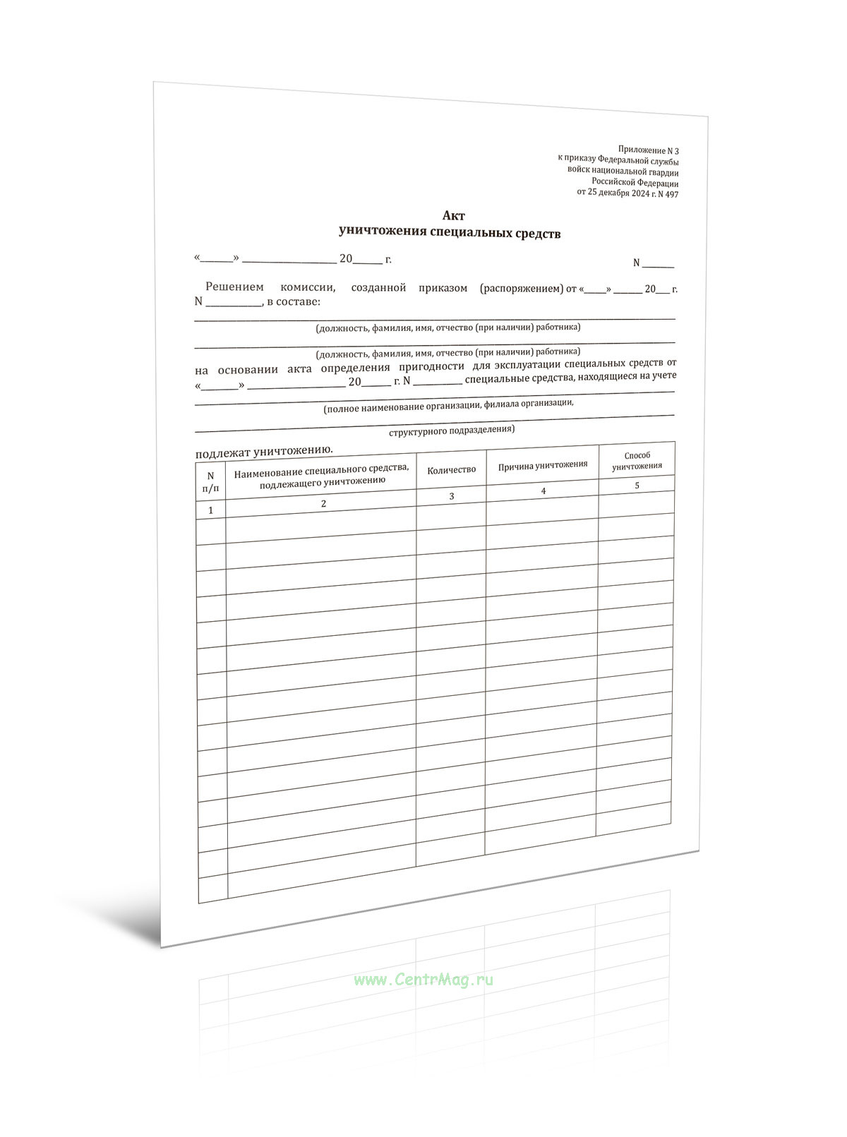Форма Акта уничтожения специальных средств соответствует Приложению № 3 к Приказу Росгвардии от 25.12.2024 N 497 "Об утверждении перечней, форм и порядков ведения документов, оформляемых ведомственной охраной федеральных государственных органов, федеральных органов исполнительной власти, высшего исполнительного органа субъекта Российской Федерации - города федерального значения Москвы, организаций, имеющих в соответствии с законодательством Российской Федерации право на создание ведомственной охраны, при приобретении, учете, передаче (возврате) специальных средств, а также публичным акционерным обществом "Сбербанк России" при передаче специальных средств"