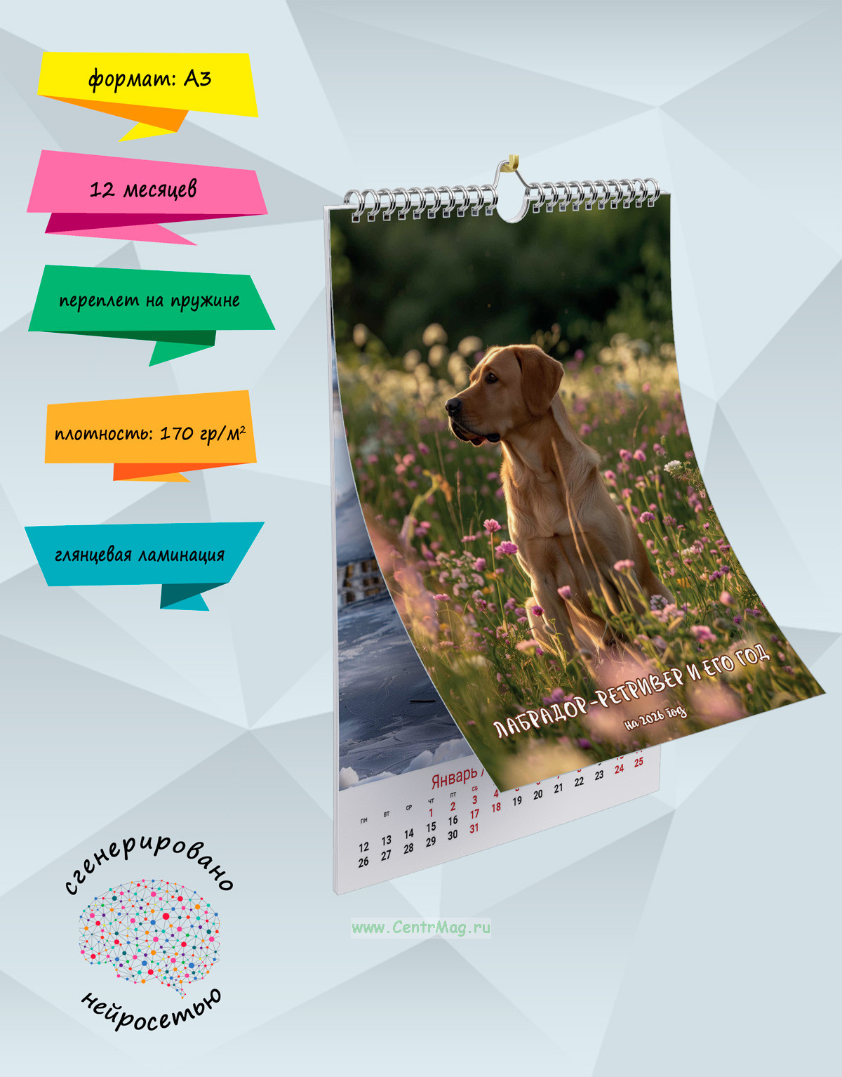 Календарь содержит изображение лабрадор-ретривера, сгенерированные с помощью нейросети, у которого распланирован весь год. Календарь будет отличным подарком для ваших родных, друзей, знакомых, коллег или даже для себя.