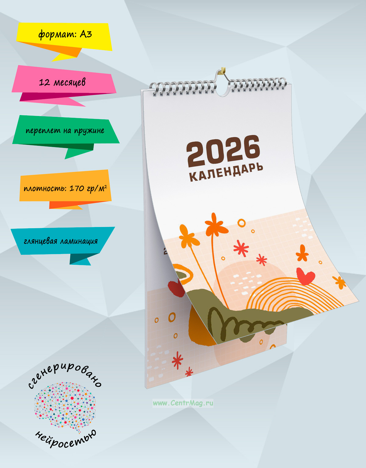 Календарь содержит завораживающие изображения абстракций на разную тему, сгенерированные с помощью нейросети. Абстракция помогает расслабиться и пофантазировать. Календарь будет отличным подарком для ваших родных, друзей, знакомых, коллег или даже для себя.