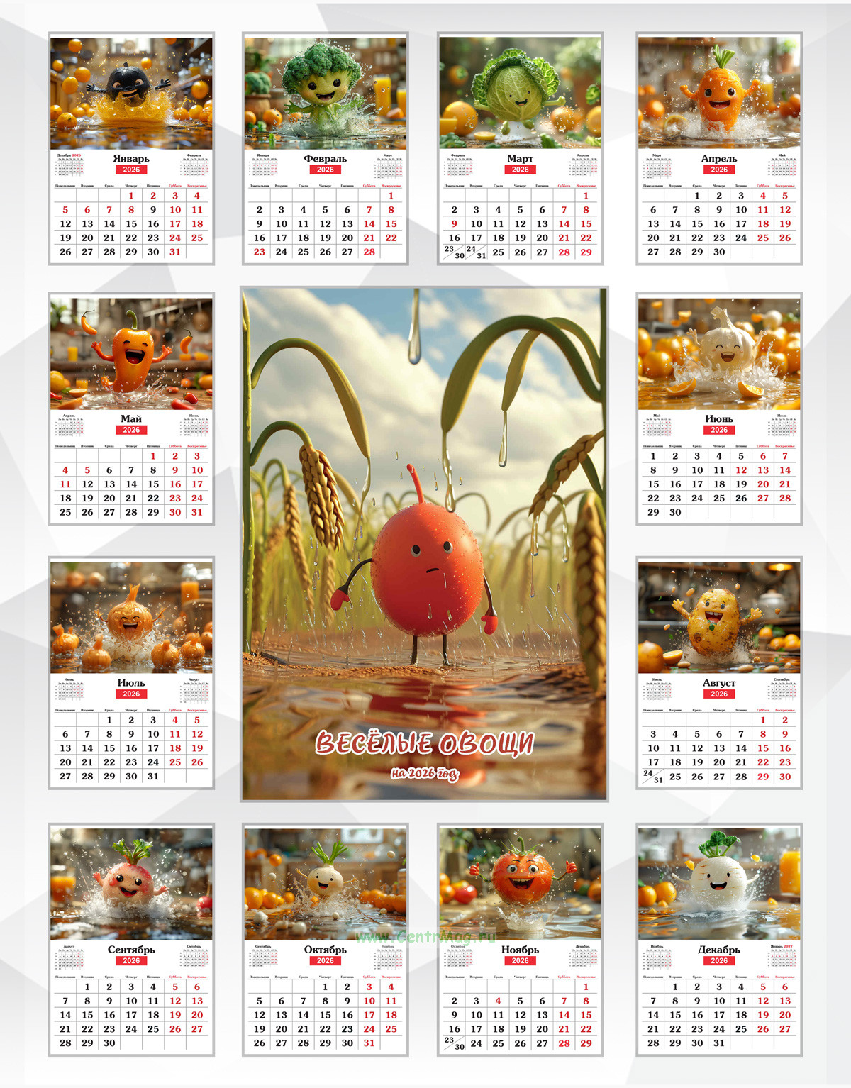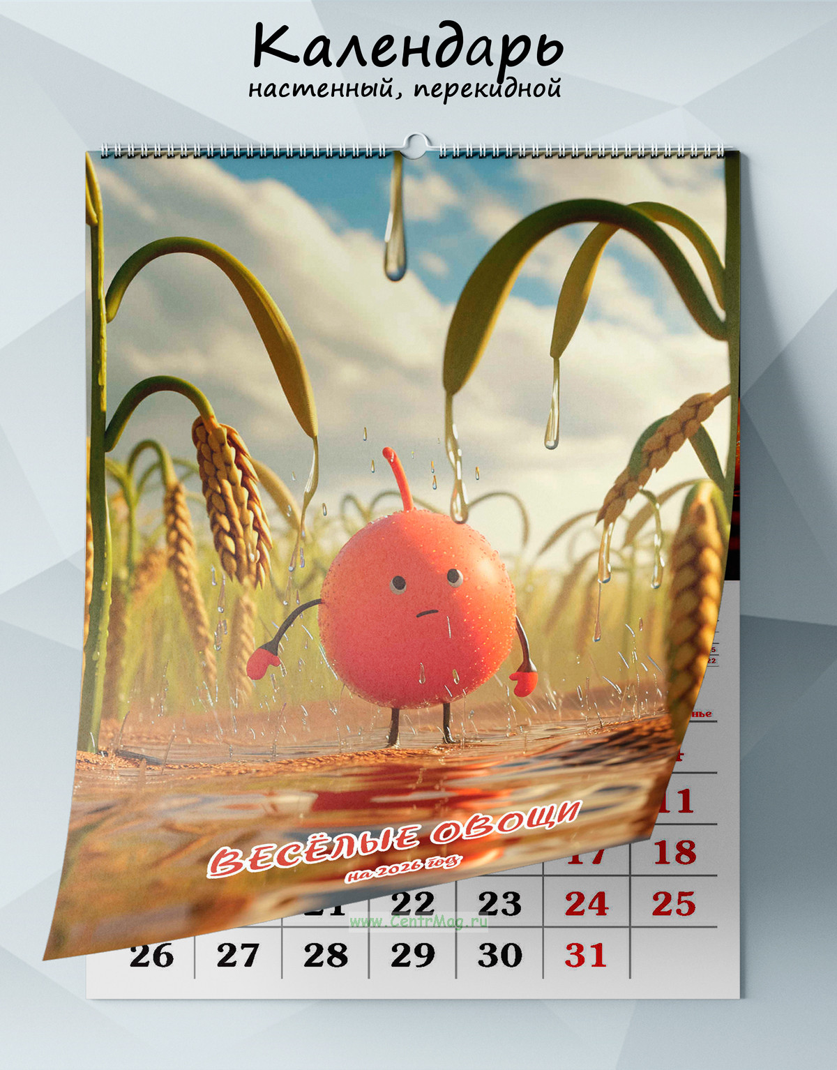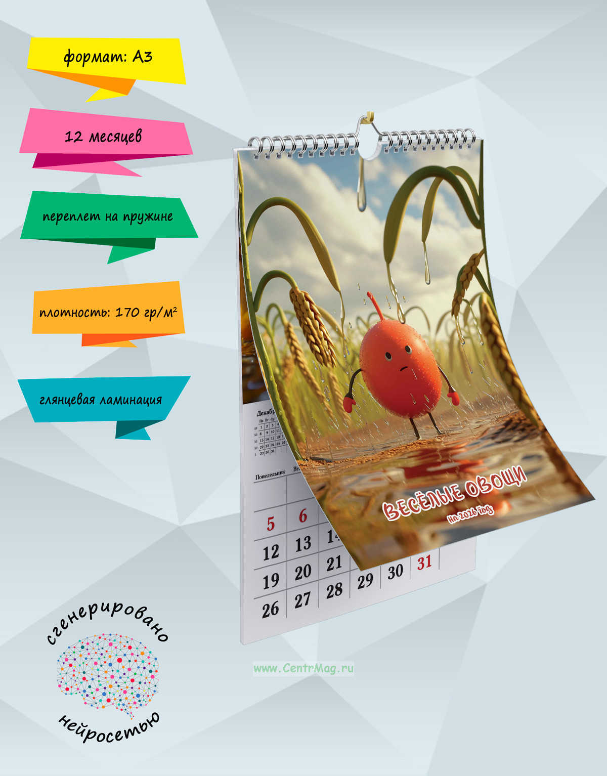 Календарь содержит смешные изображения овощей, которые плещутся в водичке, сгенерированные с помощью нейросети. Календарь будет отличным подарком для ваших родных, друзей, знакомых, коллег или даже для себя.