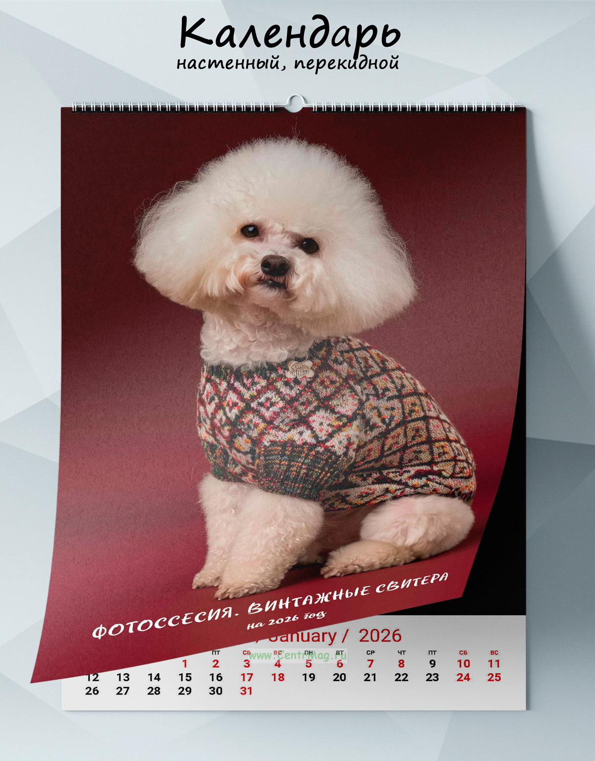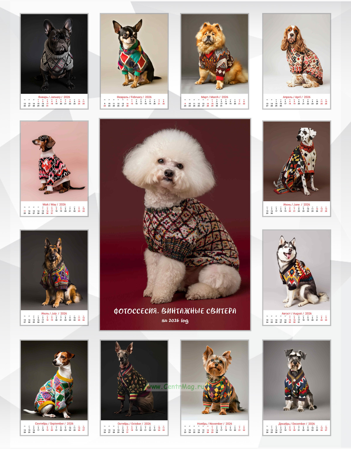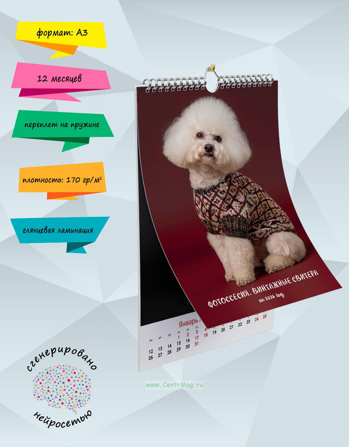 Календарь содержит изображения с фотоссесии милых собачек модников, одетых в винтажные свитера, сгенерированные с помощью нейросети. Календарь будет отличным подарком для ваших родных, друзей, знакомых, коллег или даже для себя.