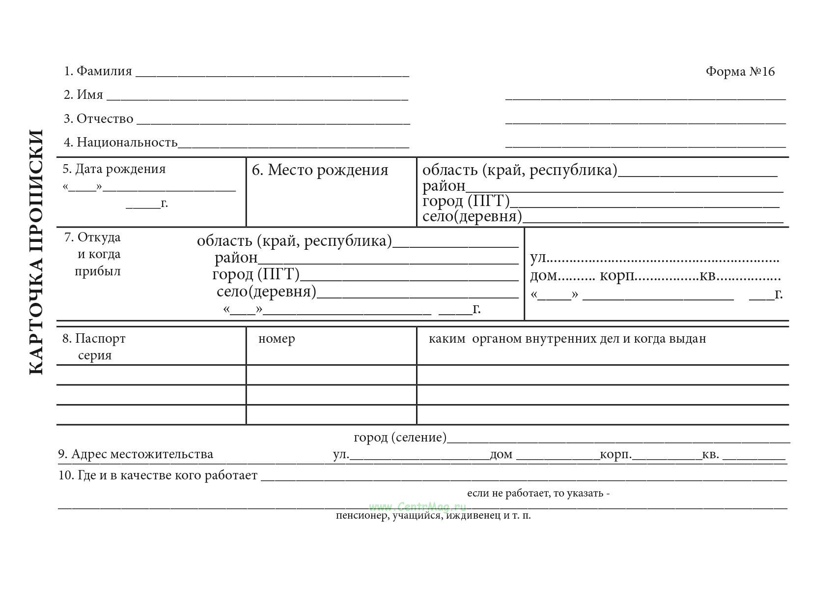 Карточка прописки (Форма №16)