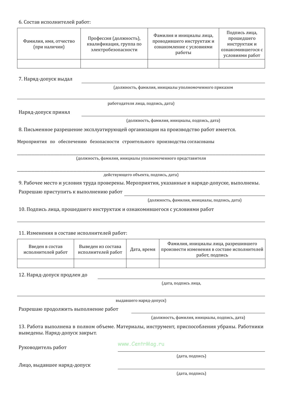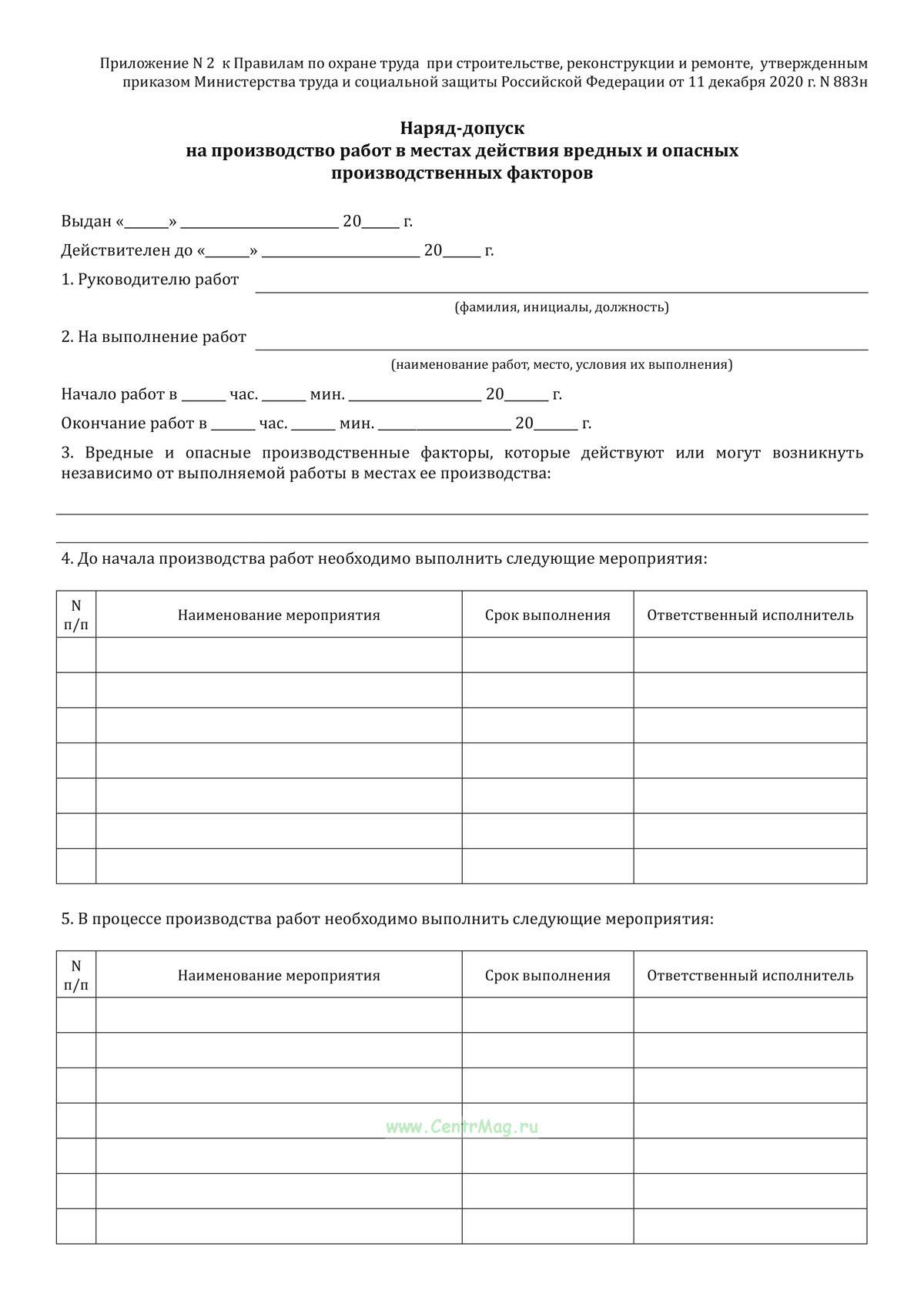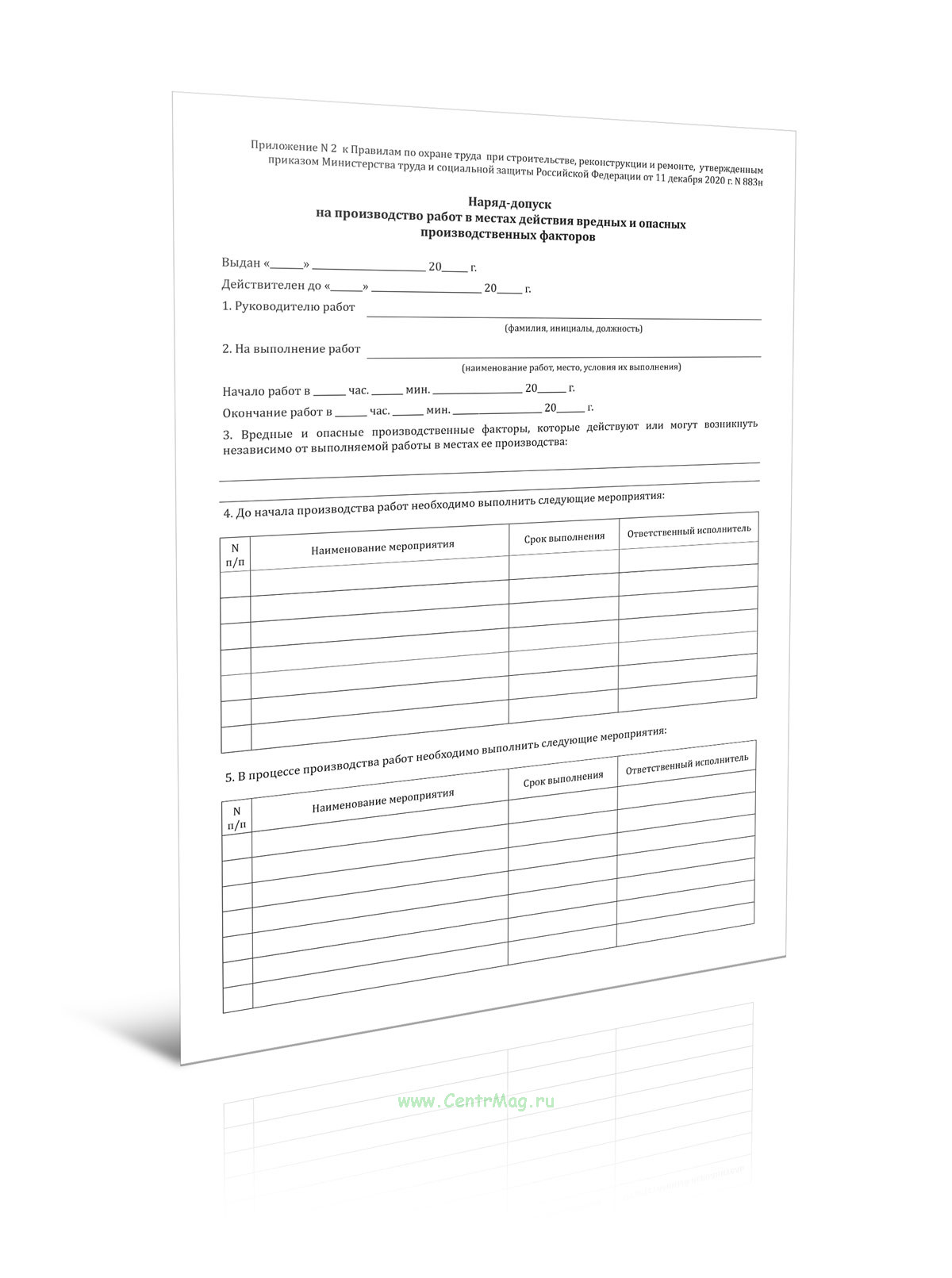 Наряд-допуск на производство работ в местах действия вредных и опасных производственных факторов продается только как чистый незаполненный бланк, без печатей и подписей соответствует 149-ФЗ от 27.07.2006