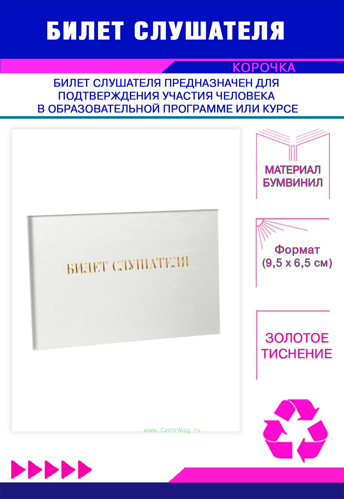 Билет слушателя предназначен для подтверждения участия человека в образовательной программе или курсе. Он содержит информацию о ФИО обучающегося, наименовании курса, учебном заведении, сроках и форме обучения, а также сведения о дате выдачи, регистрационном номере и продлении. Такой билет используется как удостоверение, подтверждающее факт обучения, особенно на краткосрочных курсах, программах повышения квалификации или тренингах.