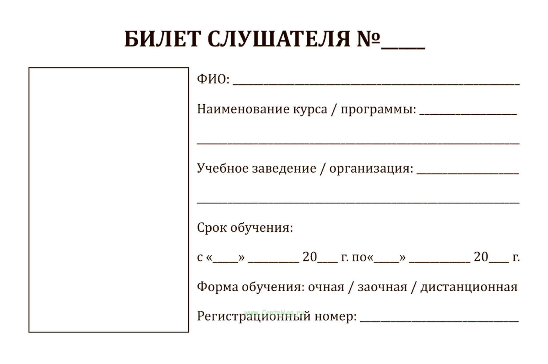 Билет слушателя предназначен для подтверждения участия человека в образовательной программе или курсе. Он содержит информацию о ФИО обучающегося, наименовании курса, учебном заведении, сроках и форме обучения, а также сведения о дате выдачи, регистрационном номере и продлении. Такой билет используется как удостоверение, подтверждающее факт обучения, особенно на краткосрочных курсах, программах повышения квалификации или тренингах.