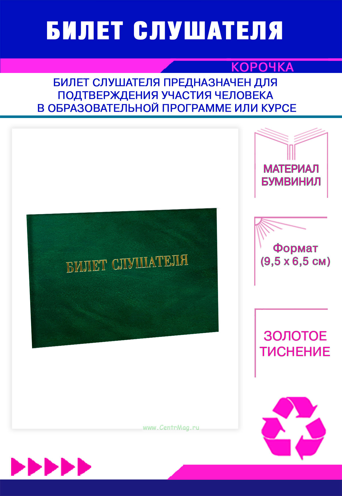 Билет слушателя предназначен для подтверждения участия человека в образовательной программе или курсе. Он содержит информацию о ФИО обучающегося, наименовании курса, учебном заведении, сроках и форме обучения, а также сведения о дате выдачи, регистрационном номере и продлении. Такой билет используется как удостоверение, подтверждающее факт обучения, особенно на краткосрочных курсах, программах повышения квалификации или тренингах.