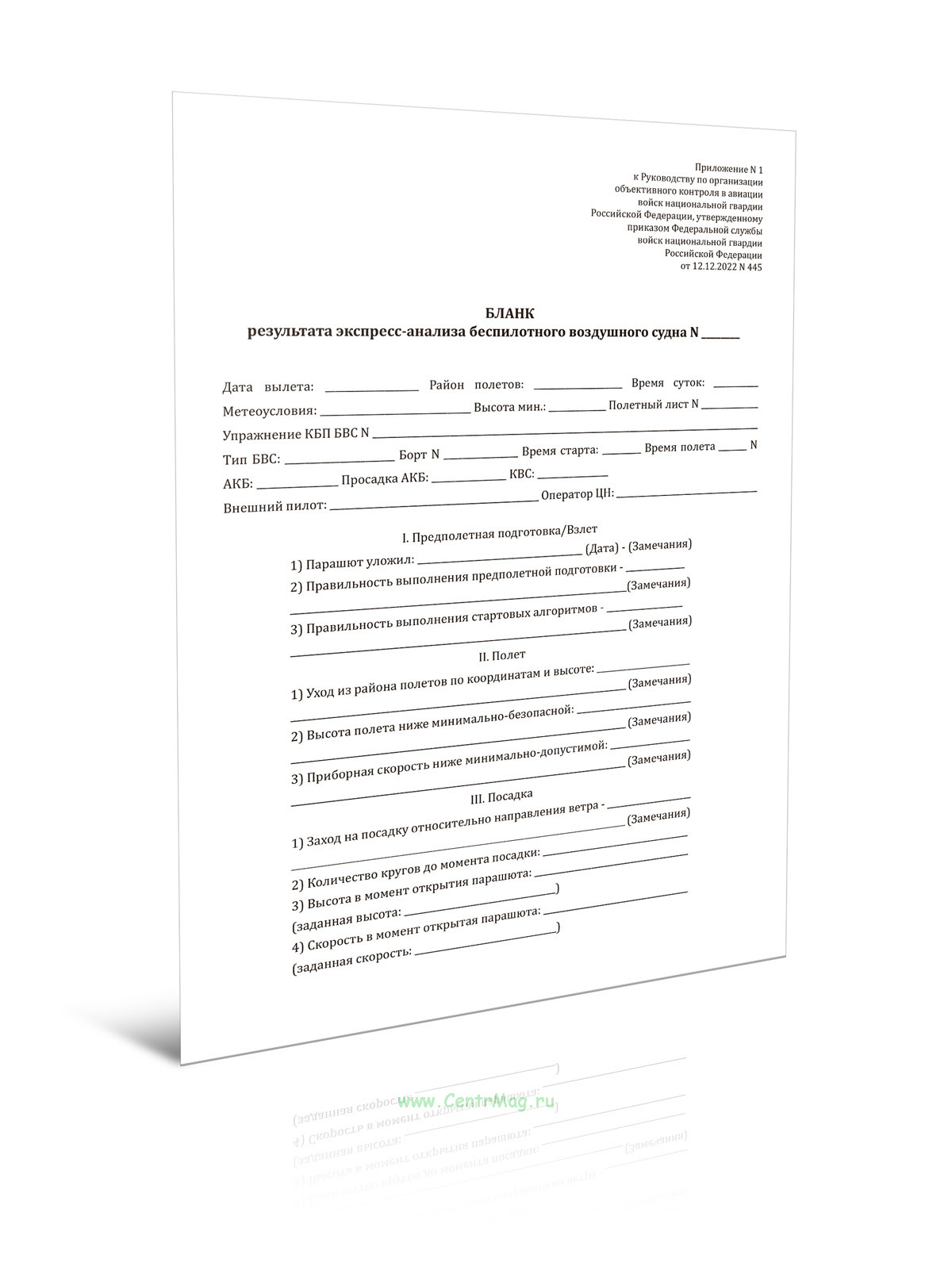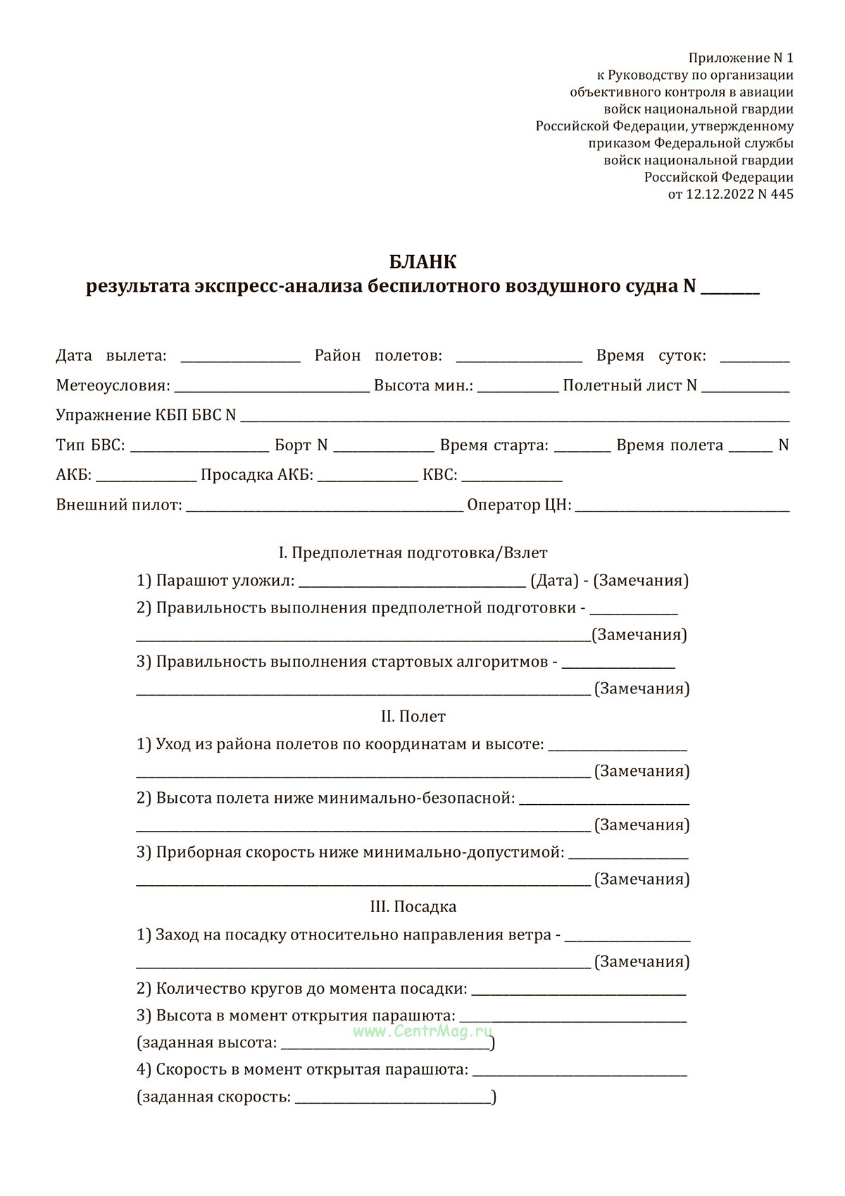 Форма Бланка результата экспресс-анализа беспилотного воздушного судна соответствует Приложению N 1 к Приказу Росгвардии от 12.12.2022 N 445 "Об утверждении Руководства по организации объективного контроля в авиации войск национальной гвардии Российской Федерации".