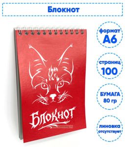 Нелинованный блокнот с мягкой обложкой из картона и бумвинила формата А6, 50 листов. Изображение кота нанесено методом шелкографии.