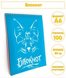Нелинованный блокнот с мягкой обложкой из картона и бумвинила формата А6, 50 листов. Изображение кота нанесено методом шелкографии.